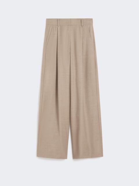 DETAILS Long trousers with a palazzo silhouette and darts at the waist on the front. Stretch wool flannel trousers Relaxed fit with flared leg at the hem Fastening with a wide waistband tab, zip fly and small hook Slant pockets at the sides Welt pockets with button at the back Belt loops at the waist COMPOSITION AND CARE 99% virgin wool, 1% elastane. Do not wash; do not bleach; do not tumble dry; cool iron; professionally dry clean perchloroethylene - mild process; do not wet clean. Distributed by Max Mara S.r.l., registered office in Reggio Emilia (Italy), Via Giulia Maramotti 4, 42124 (IT)