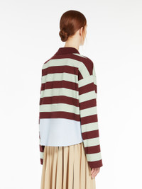 DETAILS Long-sleeved polo shirt in organic cotton and viscose jersey fabric featuring a cotton poplin insert at the hem which creates a trompe-l'oeil shirt effect. The model boasts a boxy fit, V-neckline and polo-style collar. COMPOSITION AND CARE Jersey fabric 70% cotton, 30% viscose; lower part 100% cotton. Machine wash cold delicate cycle; do not bleach; do not tumble dry; flat drying in the shade; cool iron; professionally dry clean perchloroethylene - mild process; professional wet cleaning - very mild process.; iron with a cloth between.; using neutral detergent. Distributed by Max Mara S.r.l., registered office in Reggio Emilia (Italy), Via Giulia Maramotti 4, 42124 (IT)