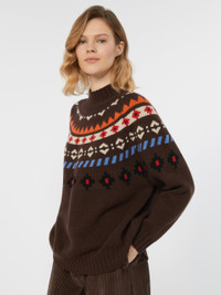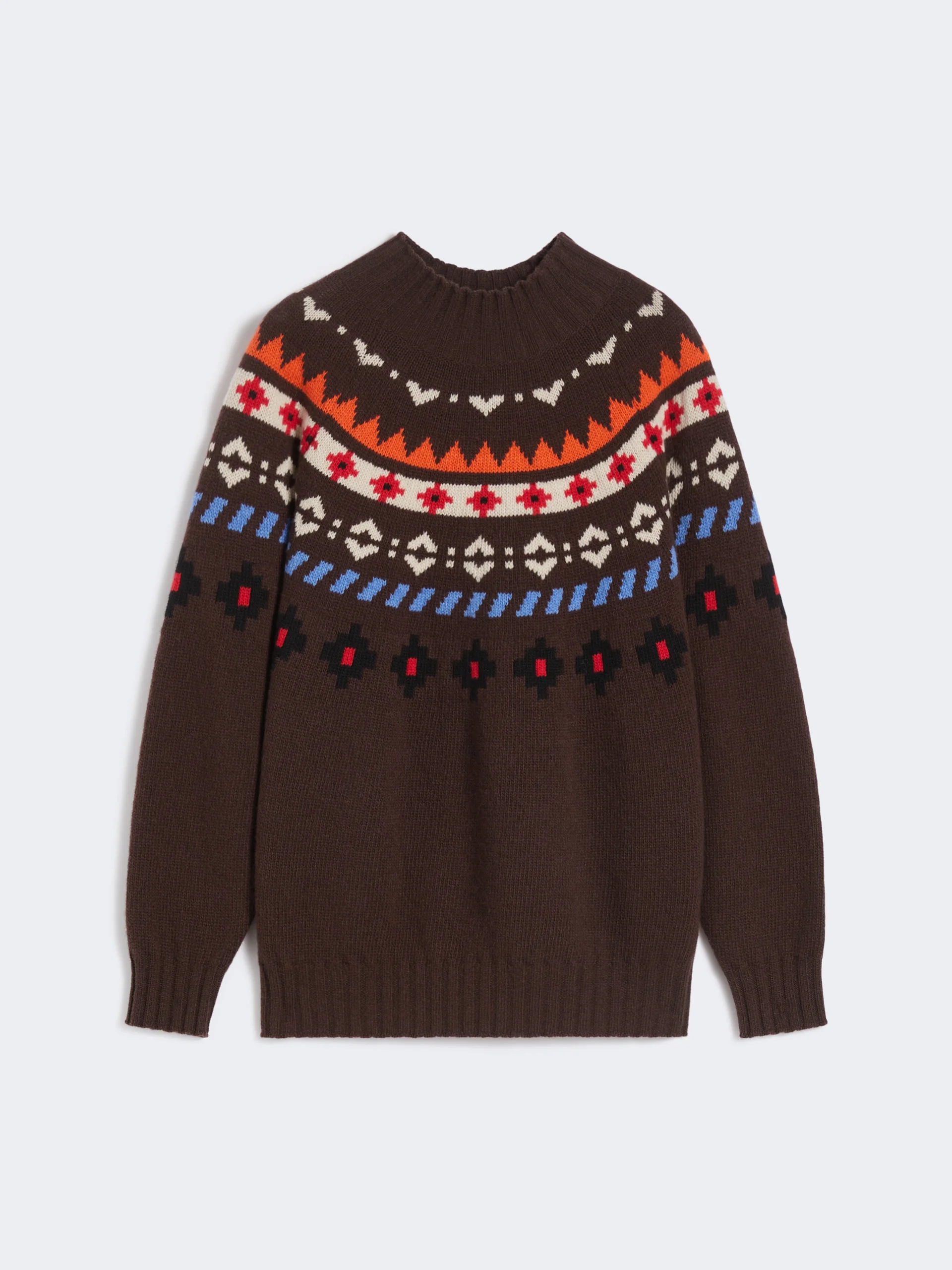 DETAILS Pullover jumper featuring a jacquard knit that creates a contrasting pattern across the entire yoke. Pure wool yarn jumper Loose fit Cowl neck Long raglan sleeves Ribbed edges COMPOSITION AND CARE 100% virgin wool. Hand wash cold (40°c max); do not bleach; do not tumble dry; flat drying in the shade; cool iron; professionally dry clean perchloroethylene - mild process; do not wet clean.; iron with a cloth between.; using neutral detergent. Distributed by Max Mara S.r.l., registered office in Reggio Emilia (Italy), Via Giulia Maramotti 4, 42124 (IT)