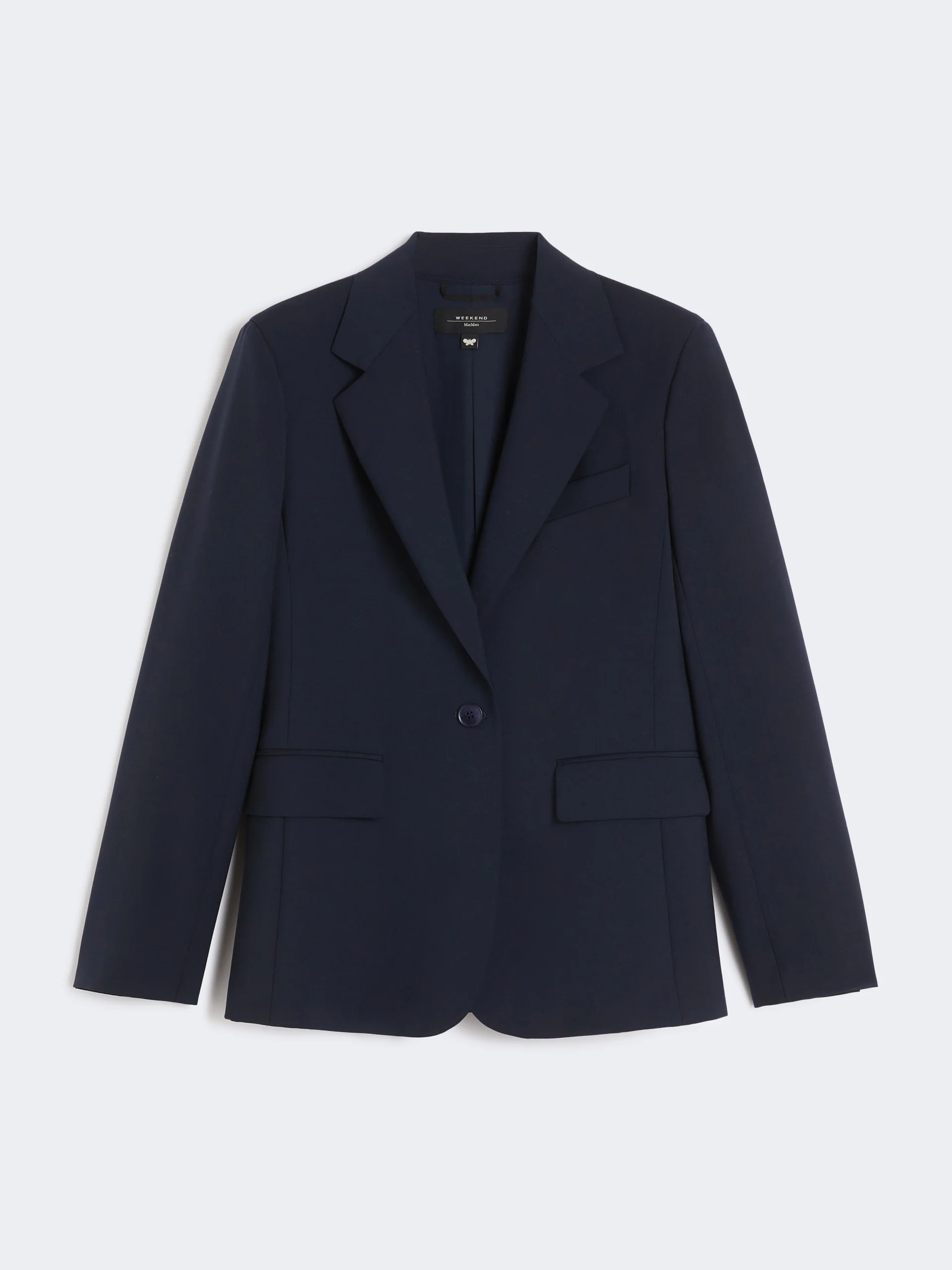 DETAILS Single-breasted blazer embellished with tailored-style details. Blazer in natural stretch pure woollen cloth Figure-skimming fit with a rear vent Lapel collar Long set-in sleeves with buttoned hem detail One-button fastening Breast pocket and flap front pockets Lined model COMPOSITION AND CARE Fabric 100% virgin wool; lining 100% polyester. Do not wash; do not bleach; do not tumble dry; cool iron; professionally dry clean perchloroethylene - mild process; do not wet clean.; wash the garment while it is fastened.; contains non-textile parts of animal origin. Distributed by Max Mara S.r.l., registered office in Reggio Emilia (Italy), Via Giulia Maramotti 4, 42124 (IT)