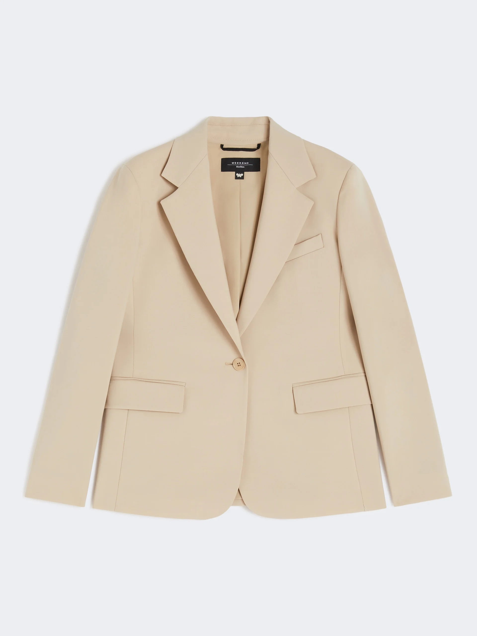 DETAILS Single-breasted blazer embellished with tailored-style details. Blazer in natural stretch pure woollen cloth Figure-skimming fit with a rear vent Lapel collar Long set-in sleeves with buttoned hem detail One-button fastening Breast pocket and flap front pockets Lined model COMPOSITION AND CARE Fabric 100% virgin wool; lining 100% polyester. Do not wash; do not bleach; do not tumble dry; cool iron; professionally dry clean perchloroethylene - mild process; do not wet clean.; wash the garment while it is fastened.; contains non-textile parts of animal origin. Distributed by Max Mara S.r.l., registered office in Reggio Emilia (Italy), Via Giulia Maramotti 4, 42124 (IT)