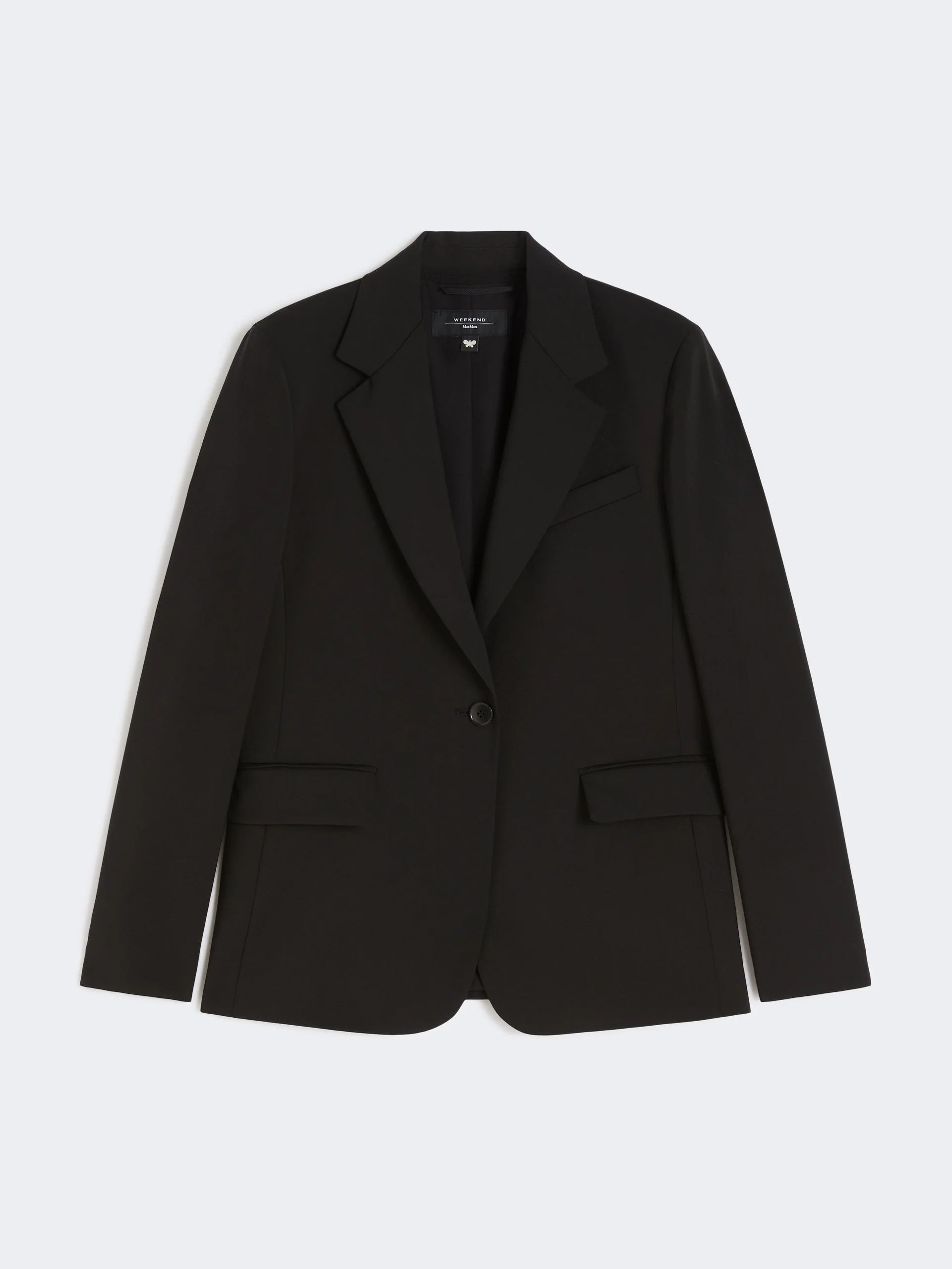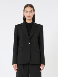 DETAILS Single-breasted blazer embellished with tailored-style details. Blazer in natural stretch pure woollen cloth Figure-skimming fit with a rear vent Lapel collar Long set-in sleeves with buttoned hem detail One-button fastening Breast pocket and flap front pockets Lined model COMPOSITION AND CARE Fabric 100% virgin wool; lining 100% polyester. Do not wash; do not bleach; do not tumble dry; cool iron; professionally dry clean perchloroethylene - mild process; do not wet clean.; wash the garment while it is fastened.; contains non-textile parts of animal origin. Distributed by Max Mara S.r.l., registered office in Reggio Emilia (Italy), Via Giulia Maramotti 4, 42124 (IT)