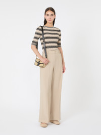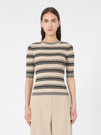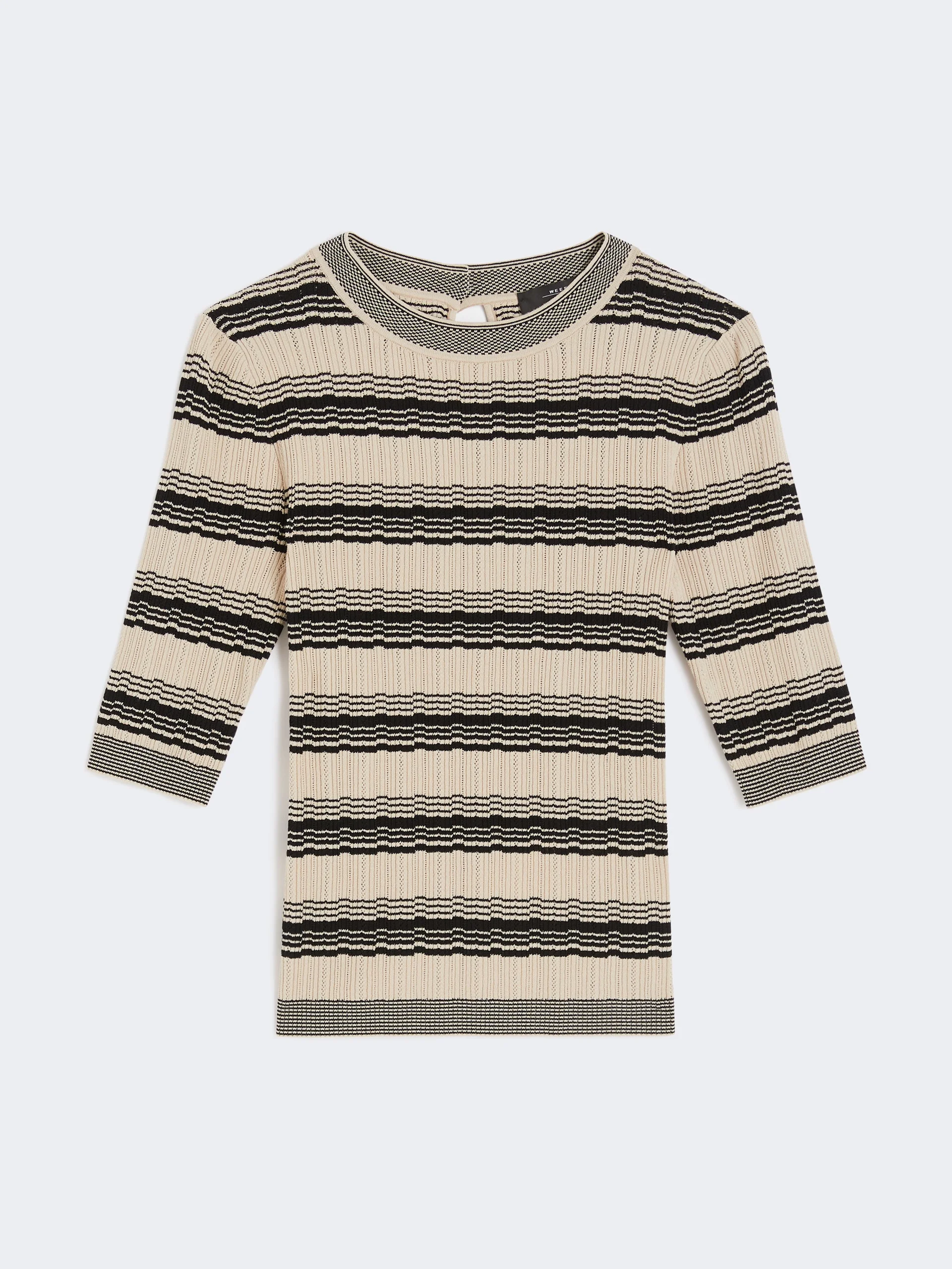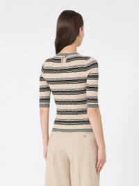 DETAILS Slim-fit knitted T-shirt. Viscose crepe yarn T-shirt Crew-neck Short set-in sleeves Small button-fastening keyhole detail at the back of the neck COMPOSITION AND CARE 83% viscose, 17% polyester. Hand wash cold; do not bleach; do not tumble dry; flat drying in the shade; cool iron; professionally dry clean perchloroethylene - mild process; do not wet clean.; iron with a cloth between.; using neutral detergent. Distributed by Max Mara S.r.l., registered office in Reggio Emilia (Italy), Via Giulia Maramotti 4, 42124 (IT)