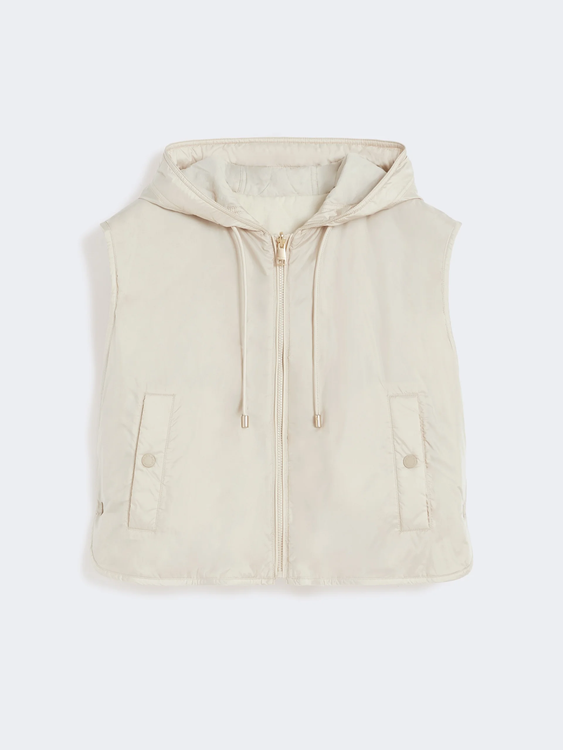 DETAILS Short gilet with a drawstring hood and the following padding: Luxepad Ultra Fine Insulating Technology Camel-Silk Blend Edition. Water-repellent canvas gilet with an onion-quilted interior Straight fit with an adjustable internal waist drawstring Front zip fastening Welt pockets on both sides Press stud-fastening side slits Weekend Max Mara logo print on the yoke lining COMPOSITION AND CARE Fabric 100% polyester; with quilting in 49% polyester, 46% camelwool, 5% silk; inner fabric 100% polyamide; internal upper part 100% cotton; - exclusive of decoration. Do not wash; do not bleach; do not tumble dry; do not iron; professionally dry clean perchloroethylene - mild process; do not wet clean.; don’t iron the labels.; protect zipper tongue and slide before cleaning.; protect the ends stoppers and/or the cord ends before washing. Distributed by Max Mara S.r.l., registered office in Reggio Emilia (Italy), Via Giulia Maramotti 4, 42124 (IT)