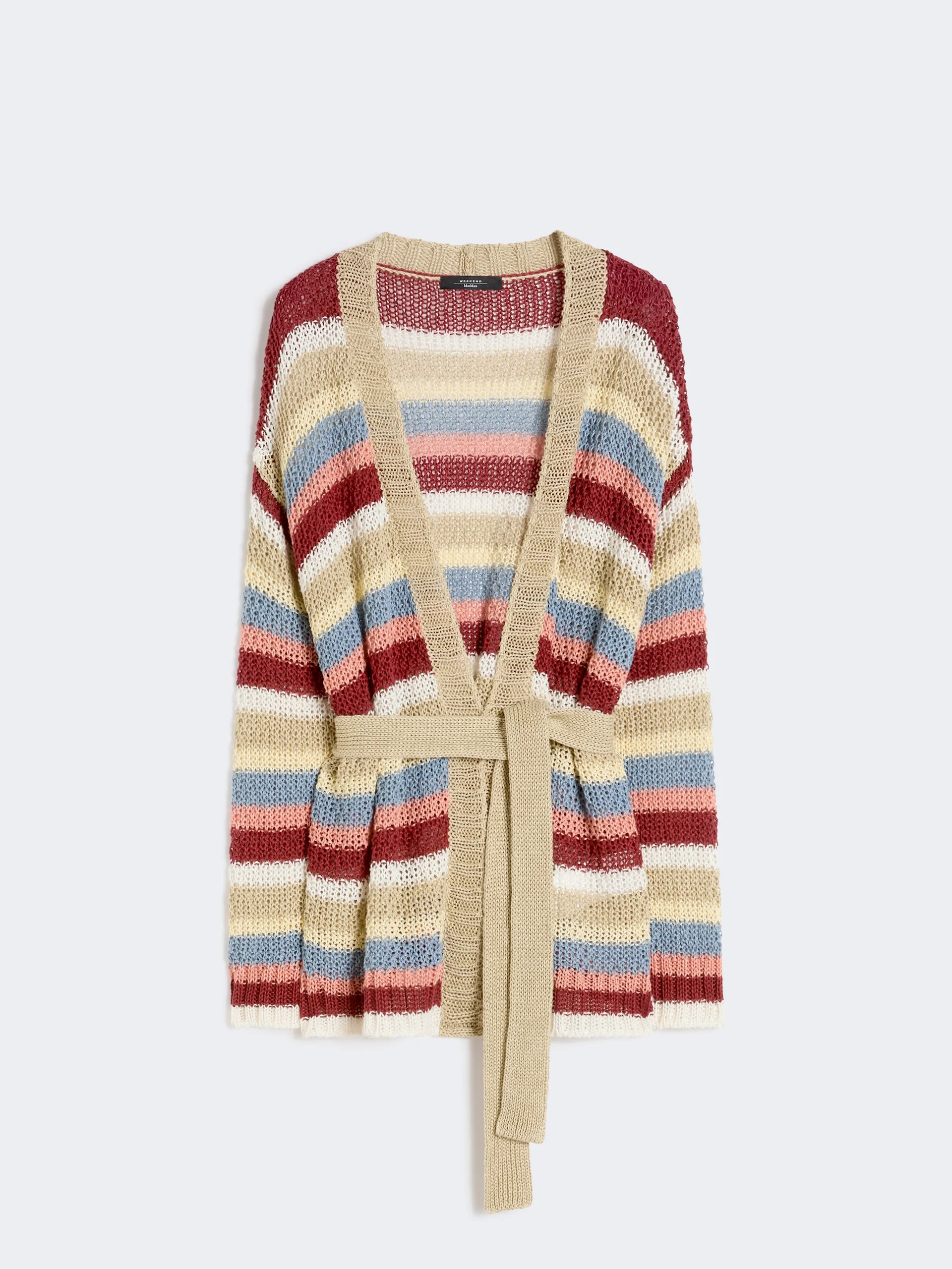 DETAILS Wrap cardigan finished with a moss stitch. - Oversize fit - Pure linen yarn cardigan - Long sleeves with dropped shoulders - Matching belt fastening - Ribbed trim COMPOSITION AND CARE 100% flaxlinen. Hand wash cold (40°c max); do not bleach; do not tumble dry; flat drying in the shade; cool iron; professionally dry clean perchloroethylene - mild process; do not wet clean.; iron with a cloth between.; using neutral detergent. Distributed by Max Mara S.r.l., registered office in Reggio Emilia (Italy), Via Giulia Maramotti 4, 42124 (IT) Collection: Weekend Max Mara Product code: 5341036206020 - WKDBONITO