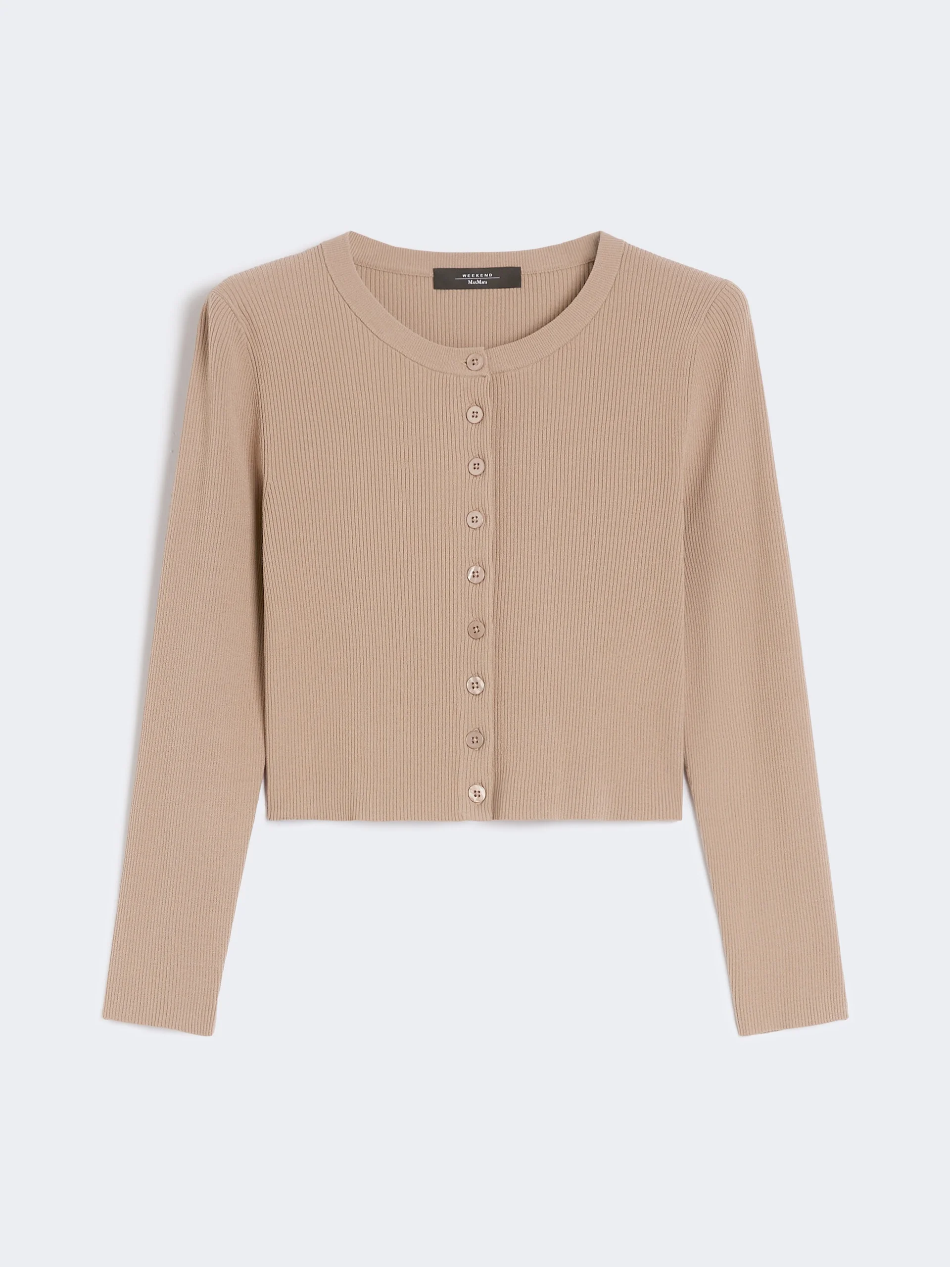 DETAILS Rib-knit petite cardigan with a cropped waist cut. - Viscose crepe yarn cardigan - Slim fit - Crew-neck - Long set-in sleeves - Tonal mother-of-pearl button fastening on the front COMPOSITION AND CARE 83% viscose, 17% polyester. Hand wash cold; do not bleach; do not tumble dry; flat drying in the shade; cool iron; professionally dry clean perchloroethylene - mild process; do not wet clean.; iron with a cloth between.; using neutral detergent. Distributed by Max Mara S.r.l., registered office in Reggio Emilia (Italy), Via Giulia Maramotti 4, 42124 (IT)