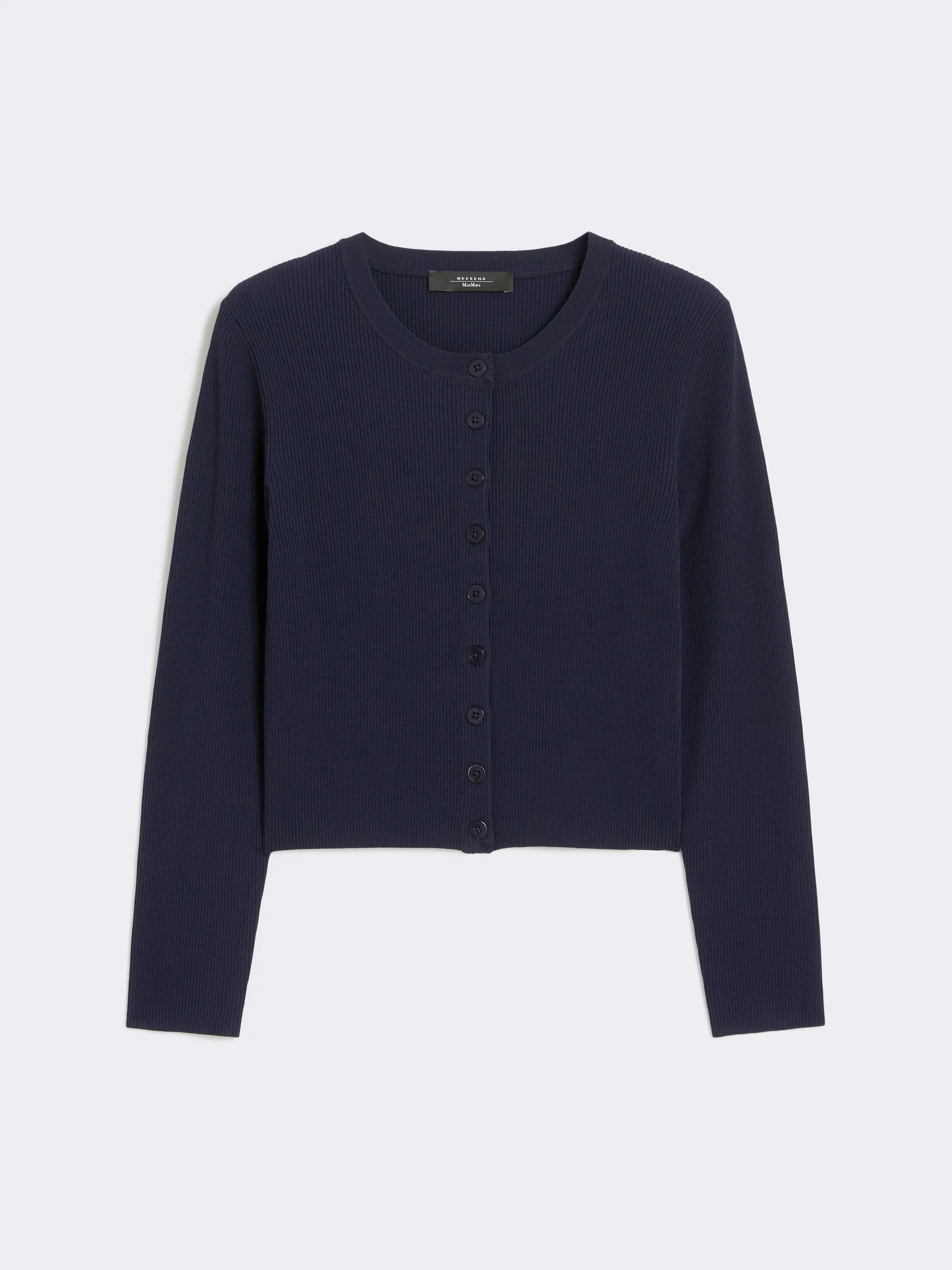 DETAILS Rib-knit petite cardigan with a cropped waist cut. Viscose crepe yarn cardigan Slim fit Crew-neck Long set-in sleeves Tonal mother-of-pearl button fastening on the front COMPOSITION AND CARE 83% viscose, 17% polyester. Hand wash cold (40°c max); do not bleach; do not tumble dry; flat drying in the shade; cool iron; professionally dry clean perchloroethylene - mild process; do not wet clean.; iron with a cloth between.; using neutral detergent. Distributed by Max Mara S.r.l., registered office in Reggio Emilia (Italy), Via Giulia Maramotti 4, 42124 (IT)