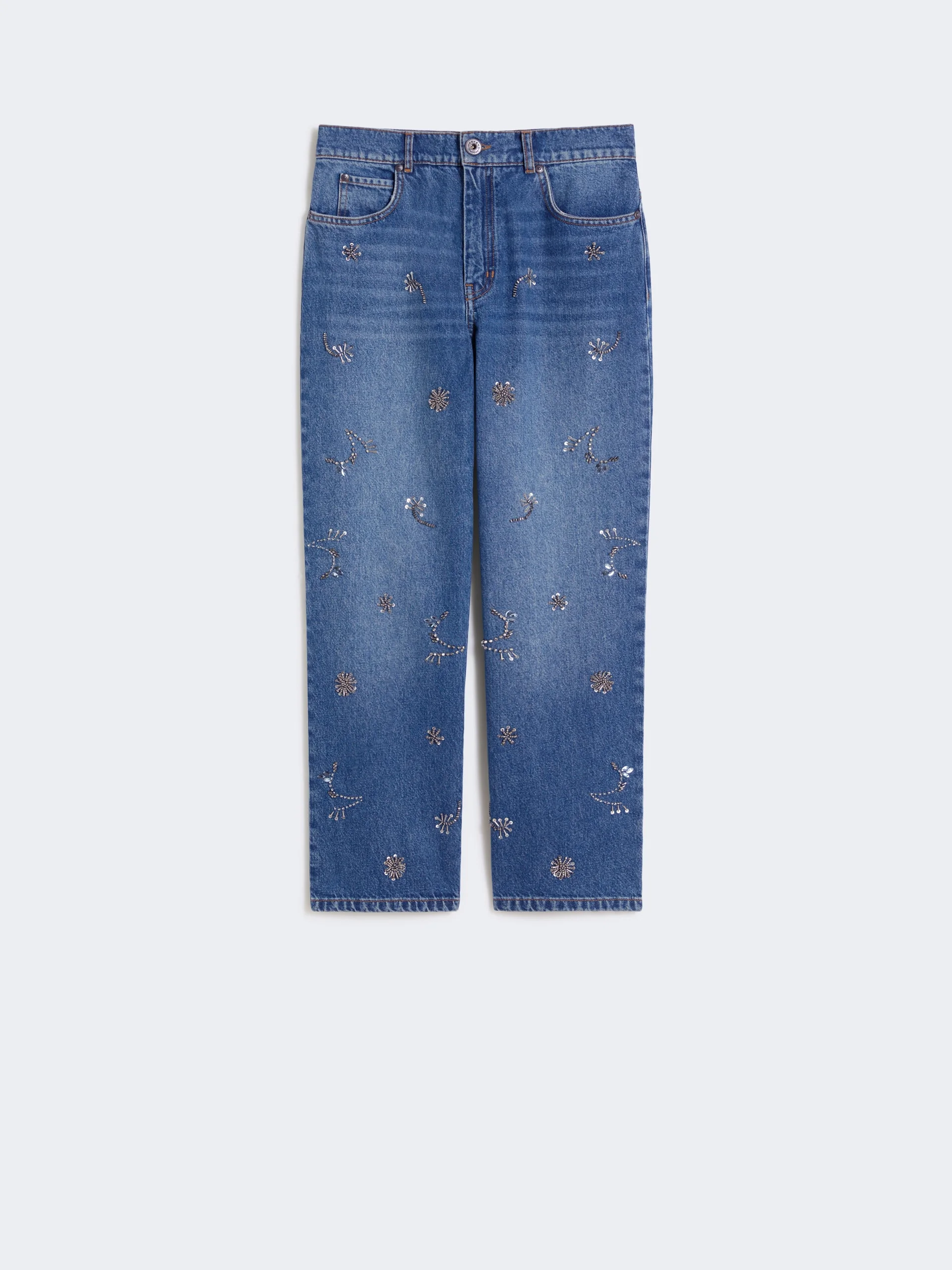 DETAILS 5-pocket jeans featuring embroidered detail on the front. - Main fabric with cotton fibers, grown and processed according to organic farming systems - Pure cotton denim jeans - Straight leg - Fly-covered zip and metal tack button fastening - Metallic rivets and belt loops at the waist - Butterfly logo label on the back pocket - Logo label on the waist back COMPOSITION AND CARE Fabric 100% cotton; joining thread 80% polyester, 20% cotton; - exclusive of decoration. Hand wash cold (40°c max); do not bleach; do not tumble dry; line drying in the shade; cool iron; do not dry clean; do not wet clean.; put this item into a string bag before washing it.; wash the garment while it is fastened.; don’t iron the labels.; turn the articles inside out before washing.; take care when wearing light-coloured clothes or accessories because, with the heat of the body, the indigo fabric , may fade and stain. be careful while sitting on light coloured surfaces, especially if wet. wash garments separately and always turned inside out. hang the garment turned inside out by avoiding to expose it to direct sunlight. avoid removing isolated stains.; contains non-textile parts of animal origin. Distributed by Max Mara S.r.l., registered office in Reggio Emilia (Italy), Via Giulia Maramotti 4, 42124 (IT) Collection: Weekend Max Mara Product code: 5181026106025 - WKDMANETTA
