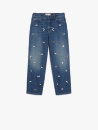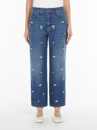 DETAILS 5-pocket jeans in pure cotton denim fabric featuring sequin and bugle bead embroidery on the front. The straight-fit model boasts belt loops at the waist, metal rivets and a grosgrain butterfly logo at the back. Fly-covered zip and tack button fastening. COMPOSITION AND CARE Fabric 100% cotton; joining thread 100% polyester; - exclusive of decoration. Hand wash cold; do not bleach; do not tumble dry; line drying in the shade; cool iron; do not dry clean; do not wet clean.; put this item into a string bag before washing it.; wash the garment while it is fastened.; don’t iron the labels.; turn the articles inside out before washing.; take care when wearing light-coloured clothes or accessories because, with the heat of the body, the denim fabric that comes into contact with them may bleed and stain. be careful while sitting on pale colored surfaces, especially if wet. wash denim items separately and always turned inside out. hang the garment turned inside out by avoiding to expose it to direct sunlight. avoid removing isolated stains.; contains non-textile parts of animal origin. Distributed by Max Mara S.r.l., registered office in Reggio Emilia (Italy), Via Giulia Maramotti 4, 42124 (IT)