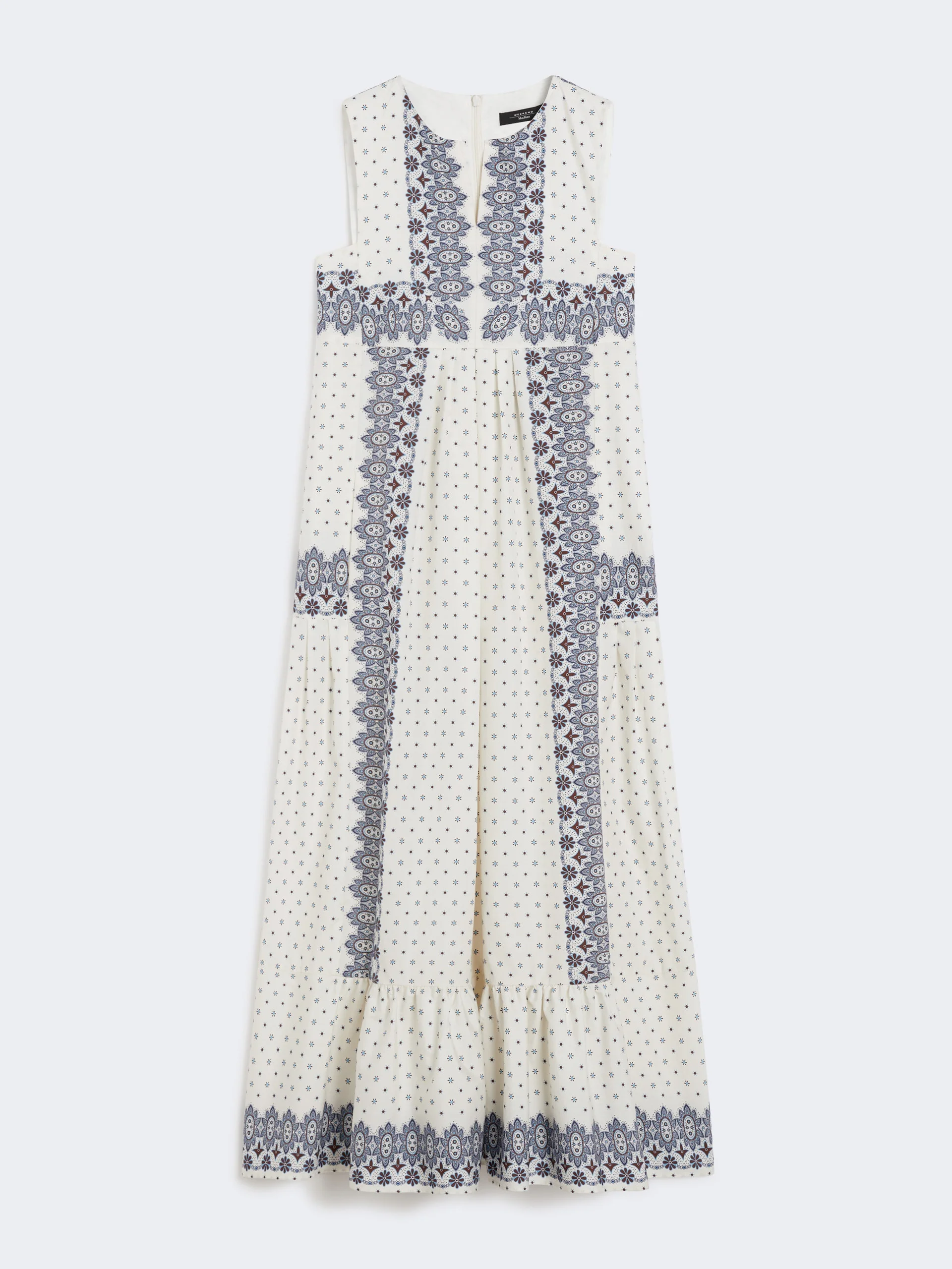 DETAILS Long dress with cut below the bust and pleated detail which adds volume to the skirt. Dress in printed pure cotton poplin fabric Flared fit with flounce detail at the hem Small V-slit on the crew-neck front Sleeveless design Back zip fastening In-seam side pockets Lined model COMPOSITION AND CARE Fabric 100% cotton; lining 100% cotton. Machine wash cold delicate cycle; do not bleach; do not tumble dry; line drying in the shade; cool iron; professionally dry clean perchloroethylene - mild process.; wash the garment while it is fastened.; contains non-textile parts of animal origin. Distributed by Max Mara S.r.l., registered office in Reggio Emilia (Italy), Via Giulia Maramotti 4, 42124 (IT)