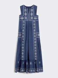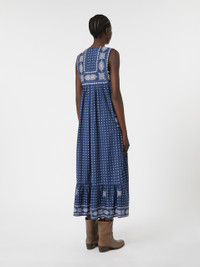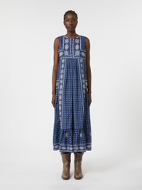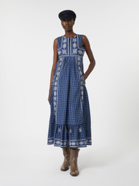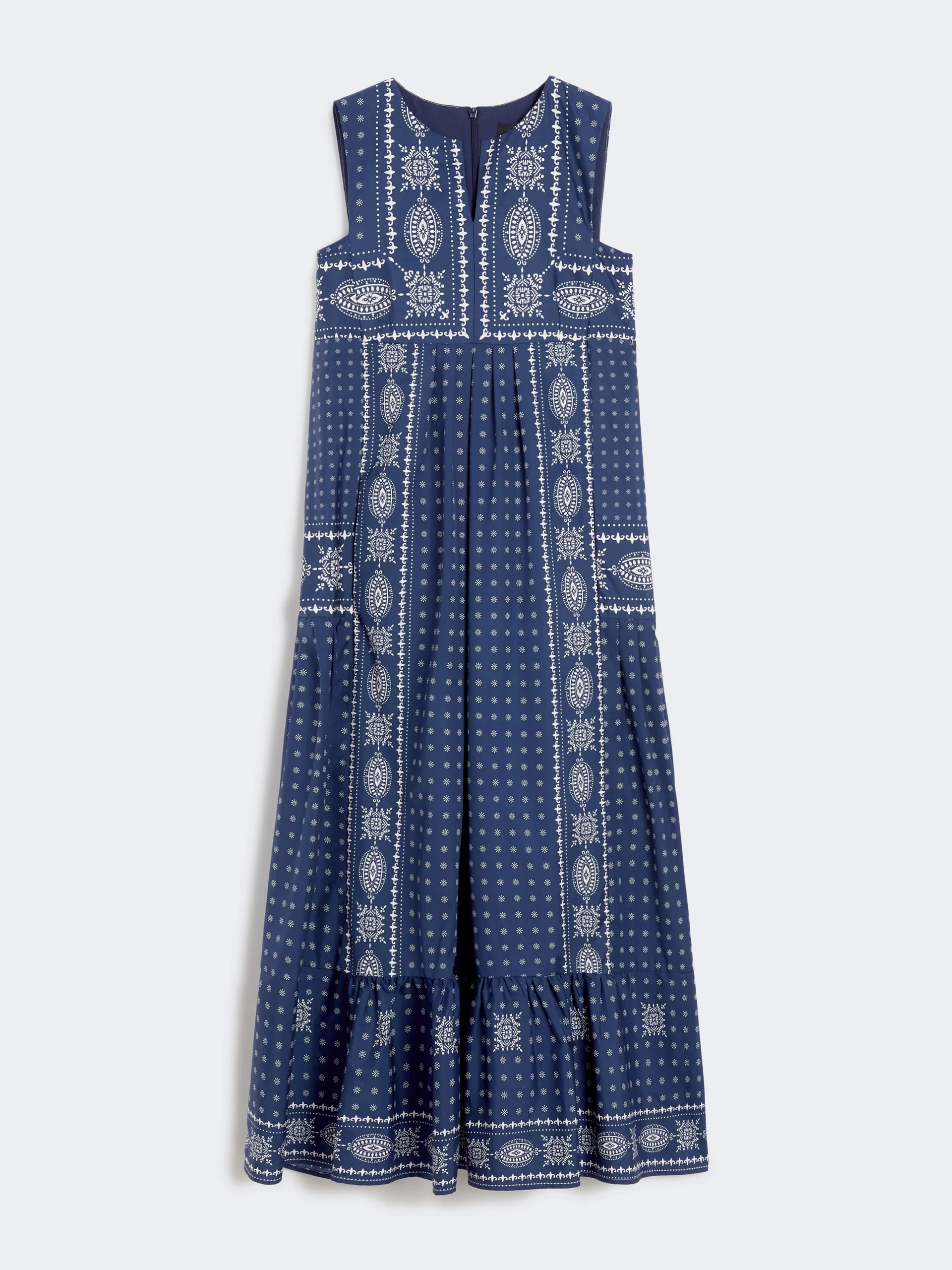 DETAILS Long dress with cut below the bust and pleated detail which adds volume to the skirt. Dress in printed pure cotton poplin fabric Flared fit with flounce detail at the hem Small V-slit on the crew-neck front Sleeveless design Back zip fastening In-seam side pockets Lined model COMPOSITION AND CARE Fabric 100% cotton; lining 100% cotton. Machine wash cold delicate cycle; do not bleach; do not tumble dry; line drying in the shade; cool iron; professionally dry clean perchloroethylene - mild process.; wash the garment while it is fastened.; contains non-textile parts of animal origin. Distributed by Max Mara S.r.l., registered office in Reggio Emilia (Italy), Via Giulia Maramotti 4, 42124 (IT)