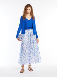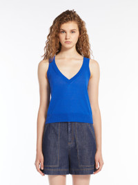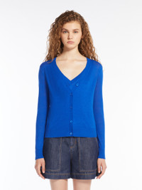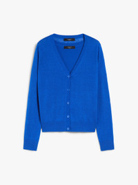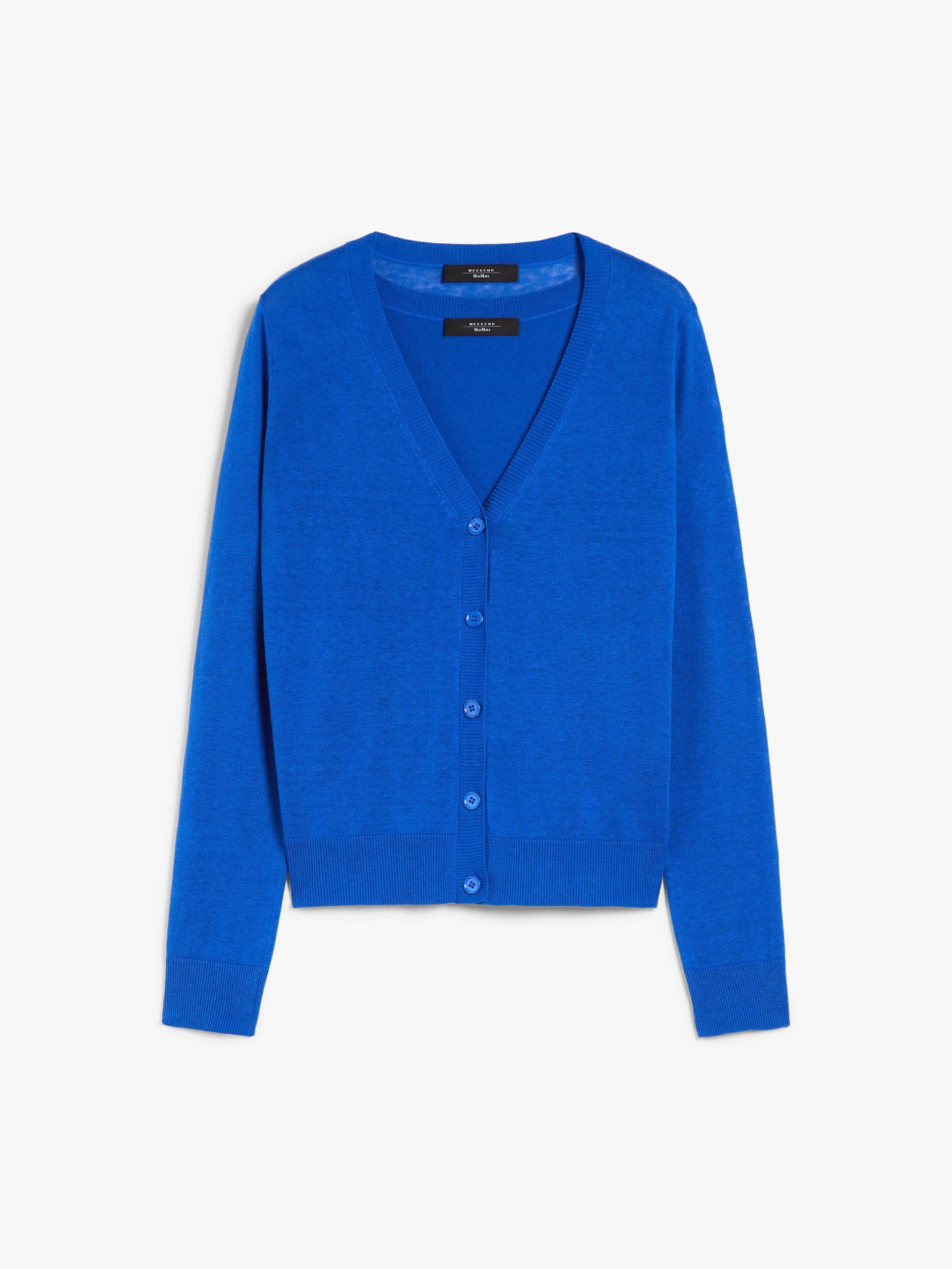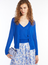 DETAILS Silk and linen yarn twin set comprising a stockinette-stitched V-neck vest top and long-sleeved cardigan; both of which boast rib-knit trims. Mother-of-pearl button fastening. Regular fit. Length: 53 cm. COMPOSITION AND CARE Knitted cardigan 55% silk, 45% flaxlinen. Sweater 55% silk, 45% flaxlinen. Knitted cardigan: hand wash cold; do not bleach; do not tumble dry; flat drying in the shade; cool iron; professionally dry clean perchloroethylene - mild process; do not wet clean.; Iron with a cloth between.; Using neutral detergent. Sweater: hand wash cold; do not bleach; do not tumble dry; flat drying in the shade; cool iron; professionally dry clean perchloroethylene - mild process; do not wet clean.; Iron with a cloth between.; Using neutral detergent. Distributed by Max Mara S.r.l., registered office in Reggio Emilia (Italy), Via Giulia Maramotti 4, 42124 (IT)
