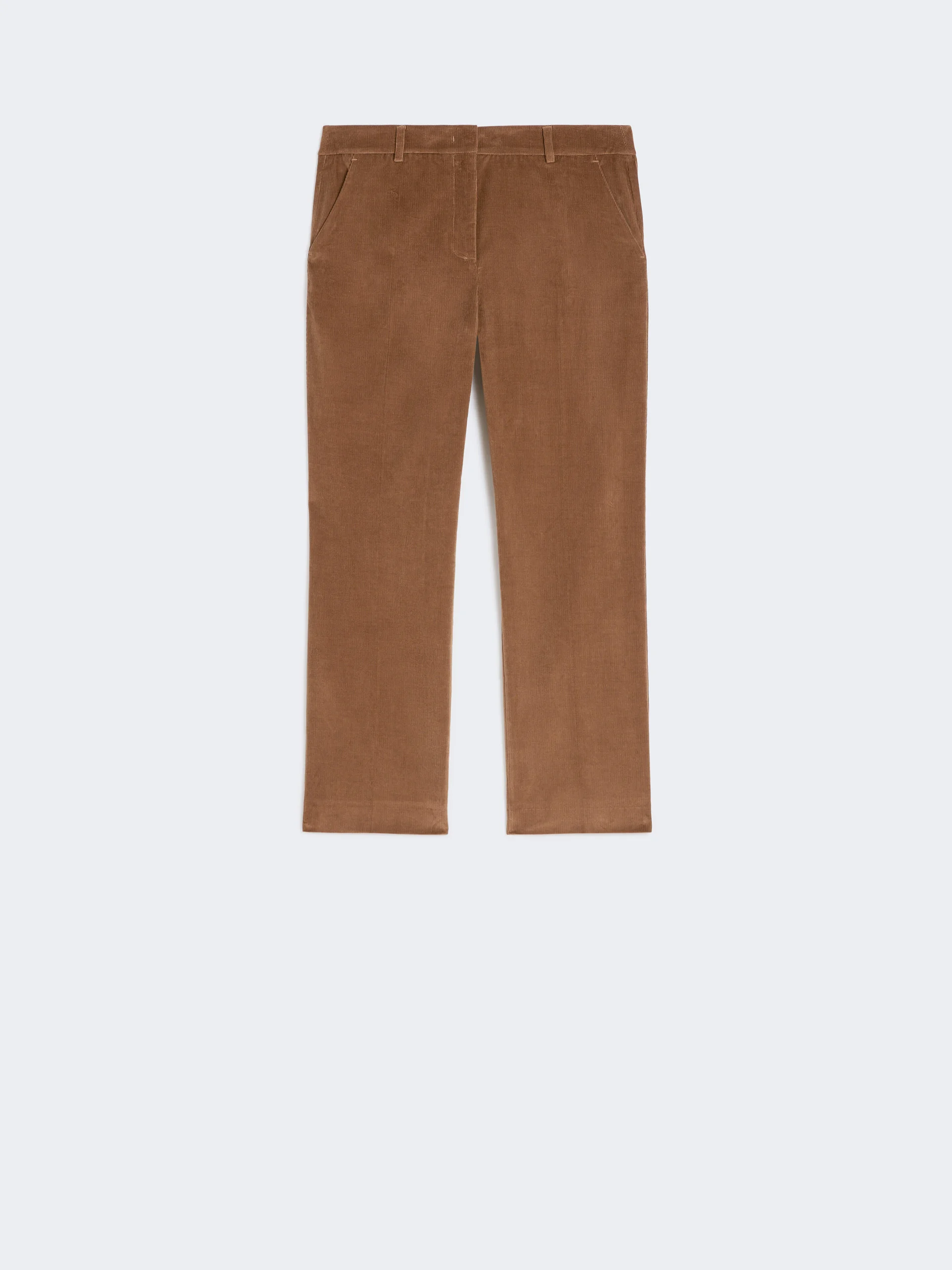 DETAILS Ribbed trousers featuring a slim-fit silhouette cropped at the ankle. Ultra-fine wale cotton velvet trousers Slightly flared skirt at the hem Fastening with high waistband tab, zip fly and small hook Slant pockets at the sides Double welt pockets with button at the back Belt loops and trouser crease COMPOSITION AND CARE 99% cotton, 1% elastane. Hand wash cold (40°c max); do not bleach; do not tumble dry; line drying in the shade; cool iron; professionally dry clean perchloroethylene - mild process; do not wet clean. Distributed by Max Mara S.r.l., registered office in Reggio Emilia (Italy), Via Giulia Maramotti 4, 42124 (IT)