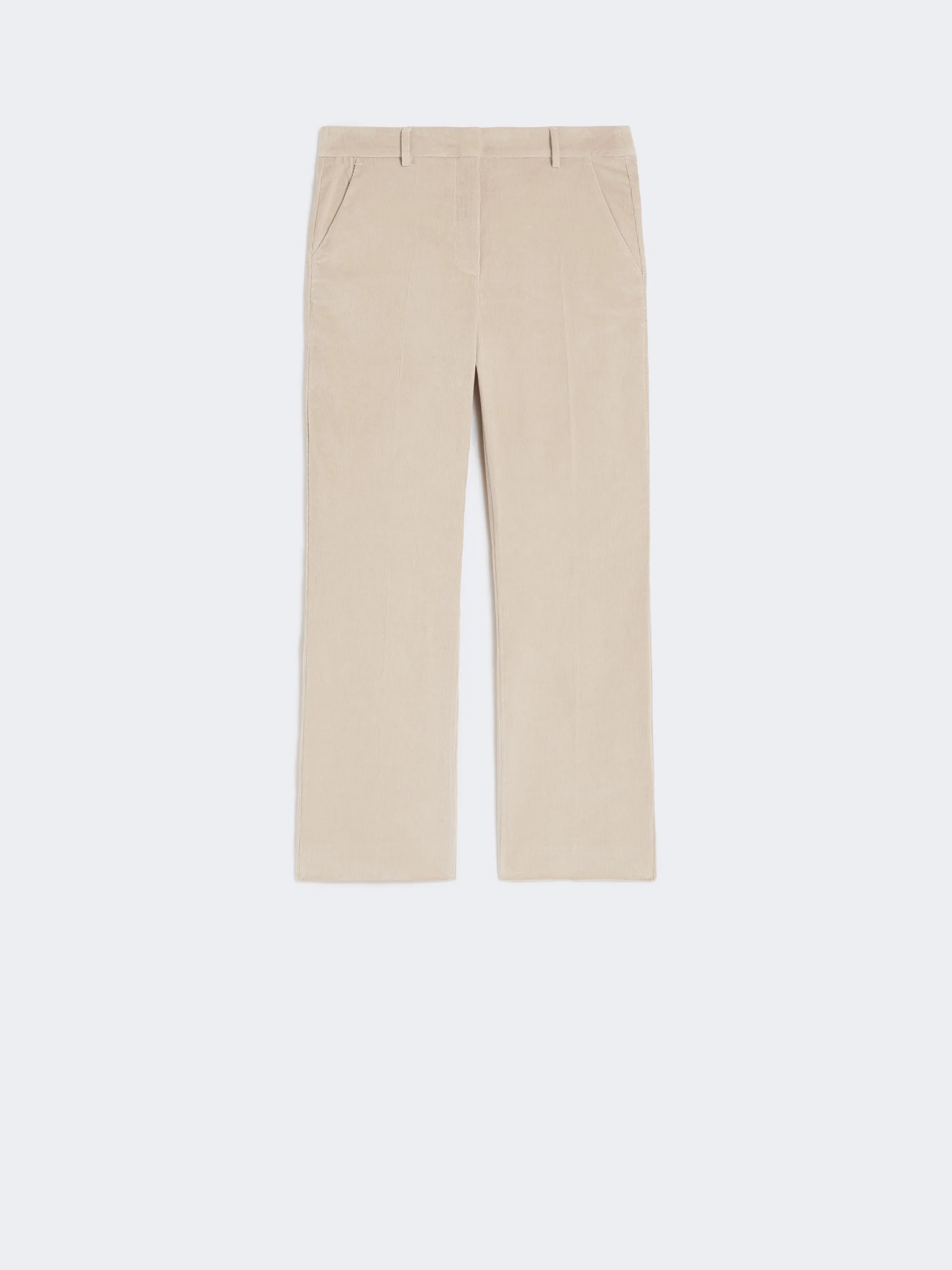 DETAILS Ribbed trousers featuring a slim-fit silhouette cropped at the ankle. Ultra-fine wale cotton velvet trousers Slightly flared skirt at the hem Fastening with high waistband tab, zip fly and small hook Slant pockets at the sides Double welt pockets with button at the back Belt loops and trouser crease COMPOSITION AND CARE 99% cotton, 1% elastane. Hand wash cold (40°c max); do not bleach; do not tumble dry; line drying in the shade; cool iron; professionally dry clean perchloroethylene - mild process; do not wet clean. Distributed by Max Mara S.r.l., registered office in Reggio Emilia (Italy), Via Giulia Maramotti 4, 42124 (IT)