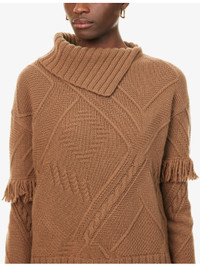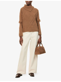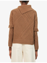PRODUCT DETAILS - Weekend Max Mara wool jumper - 100% virgin wool - Relaxed fit, asymmetric folded collar, fringe embellishment at long sleeves, all-over cable-knit and embossed pattern, all-over knitted, ribbed trims - Hand wash cold - True to size - Model is 5ft 10in/1.78m and wears a size small - Midweight, stretchy Ref: R04504414