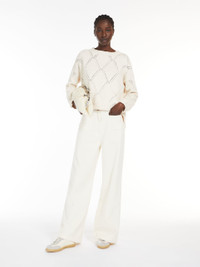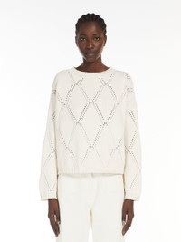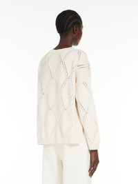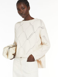 DETAILS Oversized cotton yarn crew-neck sweater featuring a distinctive openwork diamond-knit pattern. The model boasts long low set-in sleeves and a side slit-embellished asymmetrical high-low hem design. Rib-knit trims. COMPOSITION AND CARE 62% cotton, 38% polyamide. Hand wash cold; do not bleach; do not tumble dry; flat drying in the shade; cool iron; professionally dry clean perchloroethylene - mild process; do not wet clean.; iron with a cloth between.; using neutral detergent. Distributed by Max Mara S.r.l., registered office in Reggio Emilia (Italy), Via Giulia Maramotti 4, 42124 (IT)