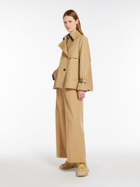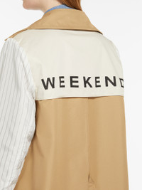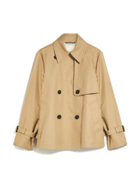 DETAILS Short trench coat in water repellent cotton gabardine fabric featuring a double breasted silhouette and iconic details. The model boasts a shirt collar, flap adorned waterproof pockets and a central rear vent. Cuff tab adjustable set in sleeves. The inner yoke is customised with a Weekend Max Mara logo print. Button fastenin COMPOSITION AND CARE Fabric 65% cotton, 35% polyester; lining 100% cotton; sleeves lining 50% polyester, 50% viscose. Do not wash; do not bleach; do not tumble dry; cool iron; professionally dry clean perchloroethylene - mild process; do not wet clean.; remove the buckle before washing.; contains non-textile parts of animal origin. Distributed by Max Mara S.r.l., registered office in Reggio Emilia (Italy), Via Giulia Maramotti 4, 42124 (IT)