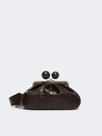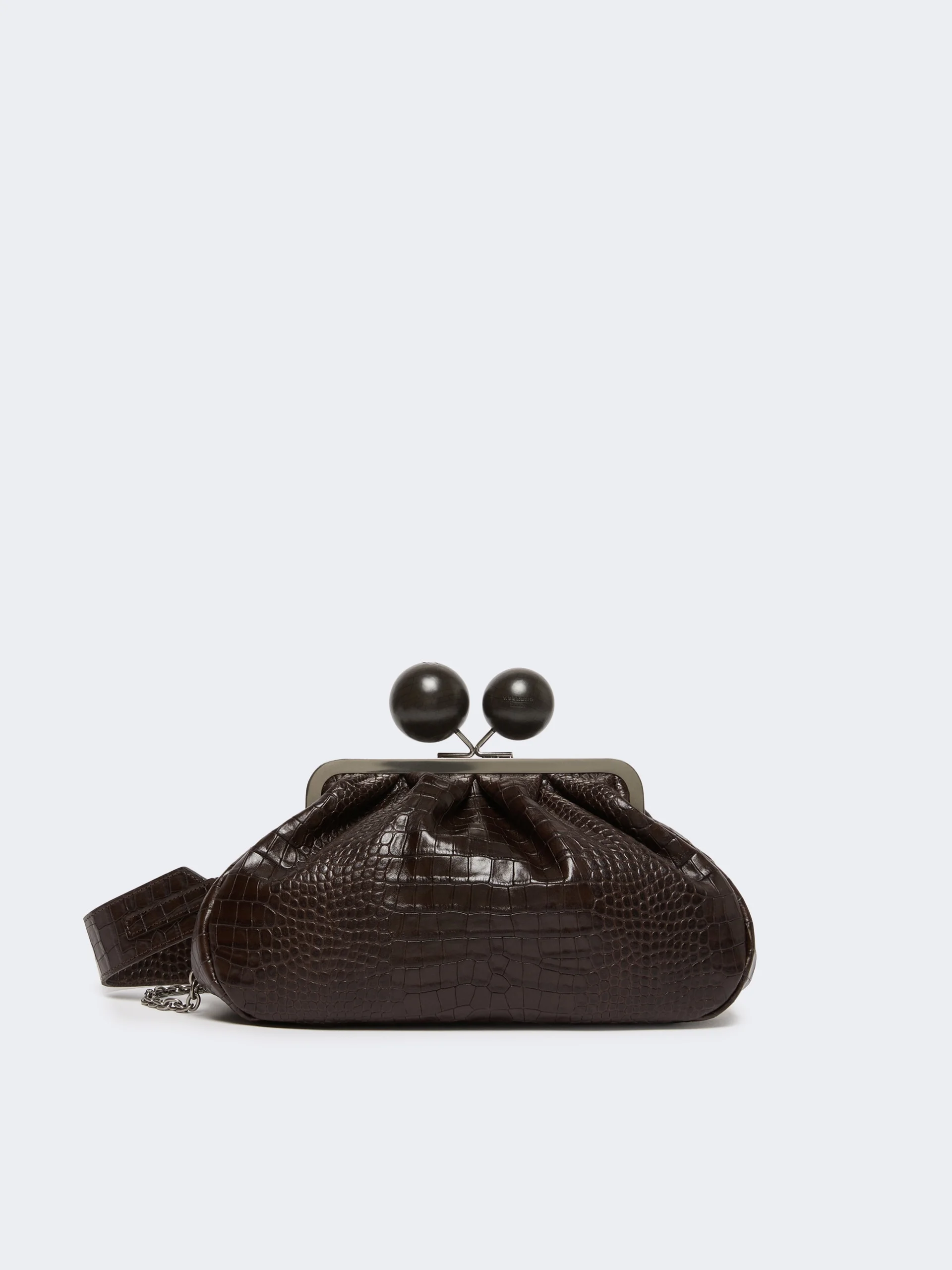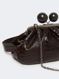 DETAILS Available in gingham, boucle, shearling or a crocodile print: the Pasticcino Bag is celebrating its tenth anniversary with a capsule that revisits its most iconic styles. - Crocodile-print calfskin bag - Striped fabric lining, a patch pocket and silver-toned label - Short leather shoulder strap and long chain strap with leather shoulder pad detail - Double shoulder strap attachment at the top or on the sides - Metal clasp with wood-look branded maxi spheres - Size: 31 x 13 x 21 cm. - Weight: 854 g - A dust bag with a silver-toned label is included COMPOSITION AND CARE Handbag in calf; lining in 100%polyester. Distributed by Max Mara S.r.l., registered office in Reggio Emilia (Italy), Via Giulia Maramotti 4, 42124 (IT) Collection: Weekend Max Mara Product code: 5511196406002 - WKAALISSO