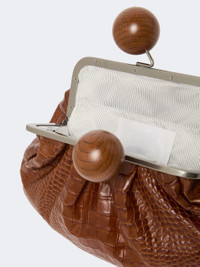 DETAILS Available in gingham, boucle, shearling or a crocodile print: the Pasticcino Bag is celebrating its tenth anniversary with a capsule that revisits its most iconic styles. - Crocodile-print calfskin bag - Striped fabric lining, a patch pocket and silver-toned label - Short leather shoulder strap and long chain strap with leather shoulder pad detail - Double shoulder strap attachment at the top or on the sides - Metal clasp with wood-look branded maxi spheres - Size: 31 x 13 x 21 cm. - Weight: 854 g - A dust bag with a silver-toned label is included COMPOSITION AND CARE Handbag in calf; lining in 100%polyester. Distributed by Max Mara S.r.l., registered office in Reggio Emilia (Italy), Via Giulia Maramotti 4, 42124 (IT) Collection: Weekend Max Mara Product code: 5511196406001 - WKAALISSO