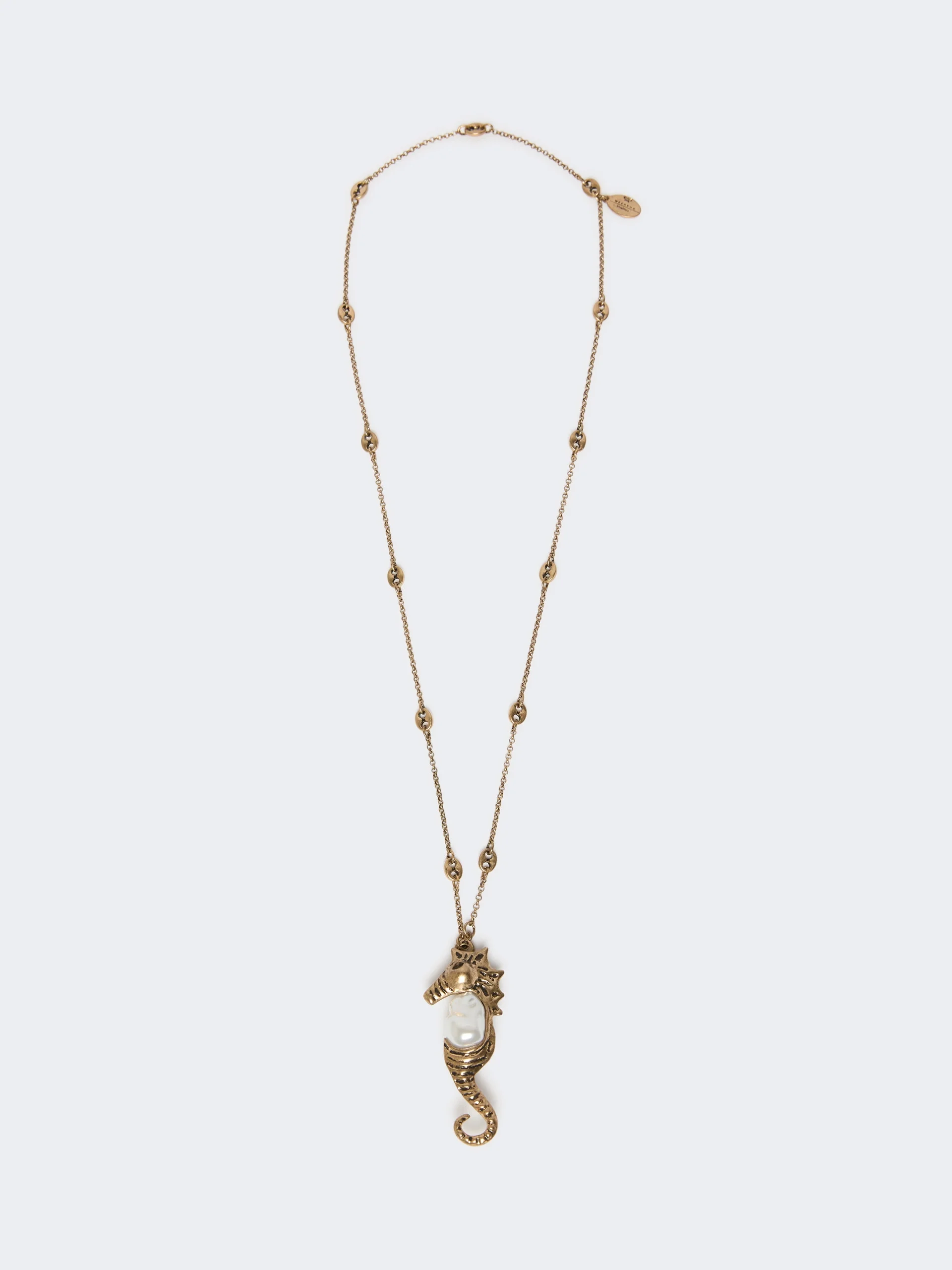 DETAILS Long chain necklace with seahorse pendant that can also be worn as a brooch. - Plated metal necklace - Pearl-effect detail set in the brooch - Weekend Max Mara metal logo plate COMPOSITION AND CARE Style in metal; with details in acrylonitrile styrene acrylate (asa). Distributed by Max Mara S.r.l., registered office in Reggio Emilia (Italy), Via Giulia Maramotti 4, 42124 (IT) Collection: Weekend Max Mara Product code: 5751046506001 - WKAGIORNO