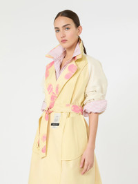 DETAILS A Weekend with an Artist celebrates creativity: five international artists reinterpret the iconic Weekend Max Mara trench coat, transforming it into a wearable work of art. - Water-repellent cotton gabardine trench coat - Flared lines and central slit at the back - Dual-use shirt collar - Long raglan sleeves with cuff straps - Button fastening and matching belt with leather buckle - Welt pockets on the sides and storm shield on the back - Partially lined, with Weekend logo on the yoke’s lining COMPOSITION AND CARE Fabric 100% cotton; lining 100% cotton; sleeves lining 65% acetate, 31% polyamide, 4% elastane. Hand wash cold (40°c max); do not bleach; do not tumble dry; line drying in the shade; cool iron; professionally dry clean perchloroethylene - mild process; do not wet clean.; do not iron trimmings.; remove the buckle before washing.; contains non-textile parts of animal origin. Distributed by Max Mara S.r.l., registered office in Reggio Emilia (Italy), Via Giulia Maramotti 4, 42124 (IT) Collection: Weekend Max Mara Product code: 5021036606001 - WKSRADIOSO