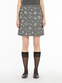 DETAILS Mini skirt in Milano-knit soft viscose-blend jersey fabric featuring embroidered sequin detail on the front. Lined model with a slightly flared fit. COMPOSITION AND CARE Jersey fabric 69% viscose, 27% polyamide, 4% elastane; lining 90% polyester, 10% elastane; - exclusive of decoration. Do not wash; do not bleach; do not tumble dry; cool iron; professionally dry clean perchloroethylene - mild process; do not wet clean.; iron with a cloth between.; turn the articles inside out before washing.; put this item into a string bag before washing it.; to be ironed on reverse. Distributed by Max Mara S.r.l., registered office in Reggio Emilia (Italy), Via Giulia Maramotti 4, 42124 (IT)