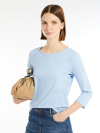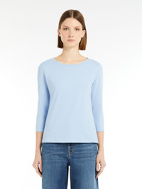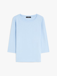 DETAILS 3/4-sleeve boat-neck T-shirt in soft stretch organic cotton jersey fabric. The straight-fit model boasts a butterfly logo print on the back of the neck. The garment's main fabric contains at least 50% cotton fibre grown according to the organic farming principles. COMPOSITION AND CARE 95% cotton, 5% elastane. Machine wash cold delicate cycle; do not bleach; do not tumble dry; flat drying in the shade; cool iron; do not dry clean; professional wet cleaning - very mild process.; iron with a cloth between.; using neutral detergent.; turn the articles inside out before washing.; to be ironed on reverse. Distributed by Max Mara S.r.l., registered office in Reggio Emilia (Italy), Via Giulia Maramotti 4, 42124 (IT)