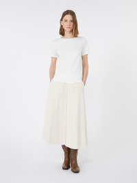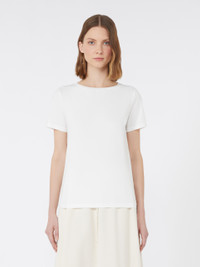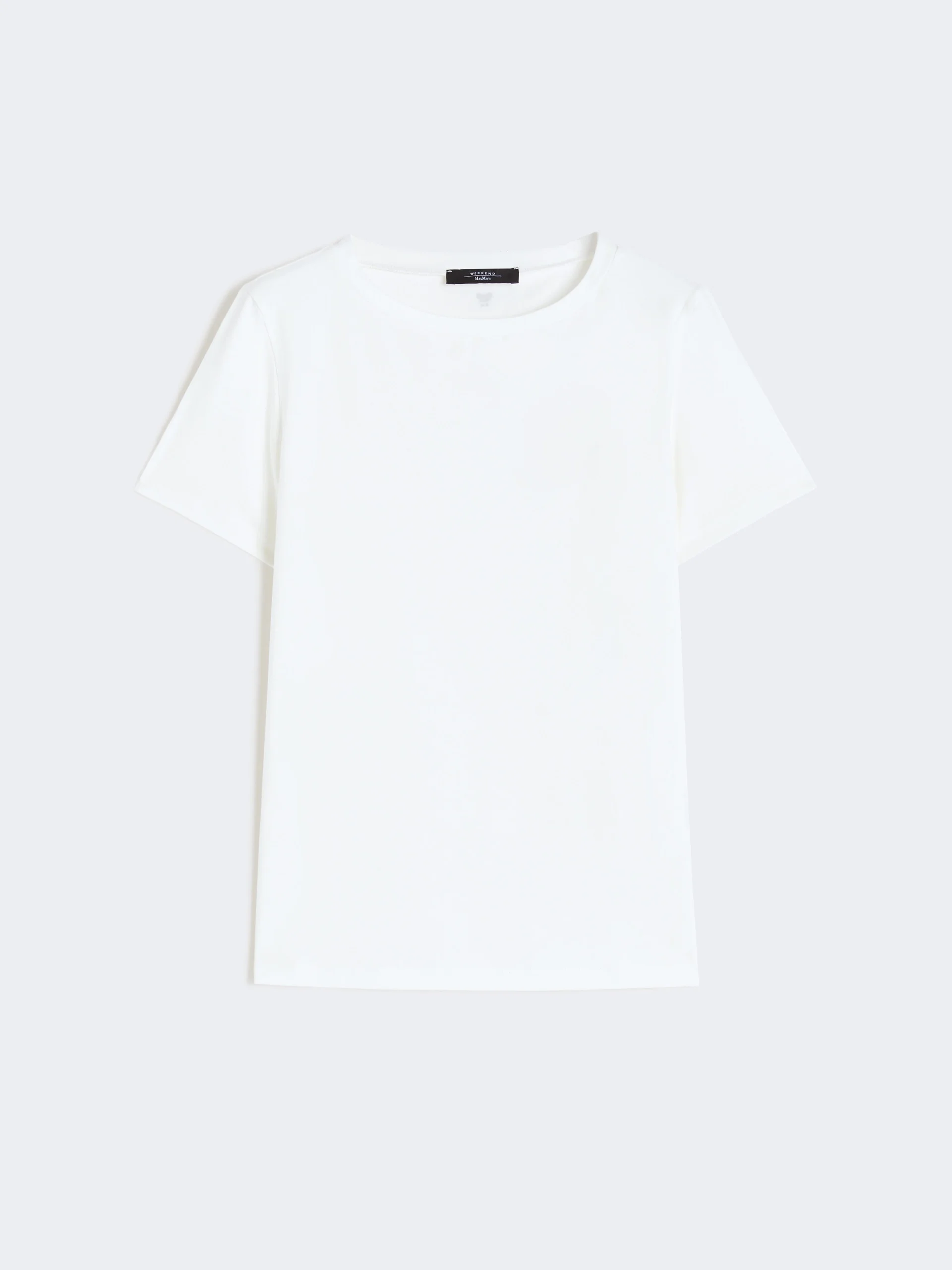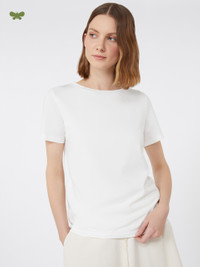 DETAILS Basic T-shirt with a regular fit and cut. Main fabric with at least 50% cotton fibers, grown and processed according to organic farming systems Stretch organic cotton jersey T-shirt Crew-neck Short set-in sleeves COMPOSITION AND CARE 95% cotton, 5% elastane. Machine wash cold delicate cycle; do not bleach; do not tumble dry; flat drying in the shade; cool iron; do not dry clean; professional wet cleaning - very mild process.; iron with a cloth between.; using neutral detergent.; turn the articles inside out before washing.; to be ironed on reverse. Distributed by Max Mara S.r.l., registered office in Reggio Emilia (Italy), Via Giulia Maramotti 4, 42124 (IT)