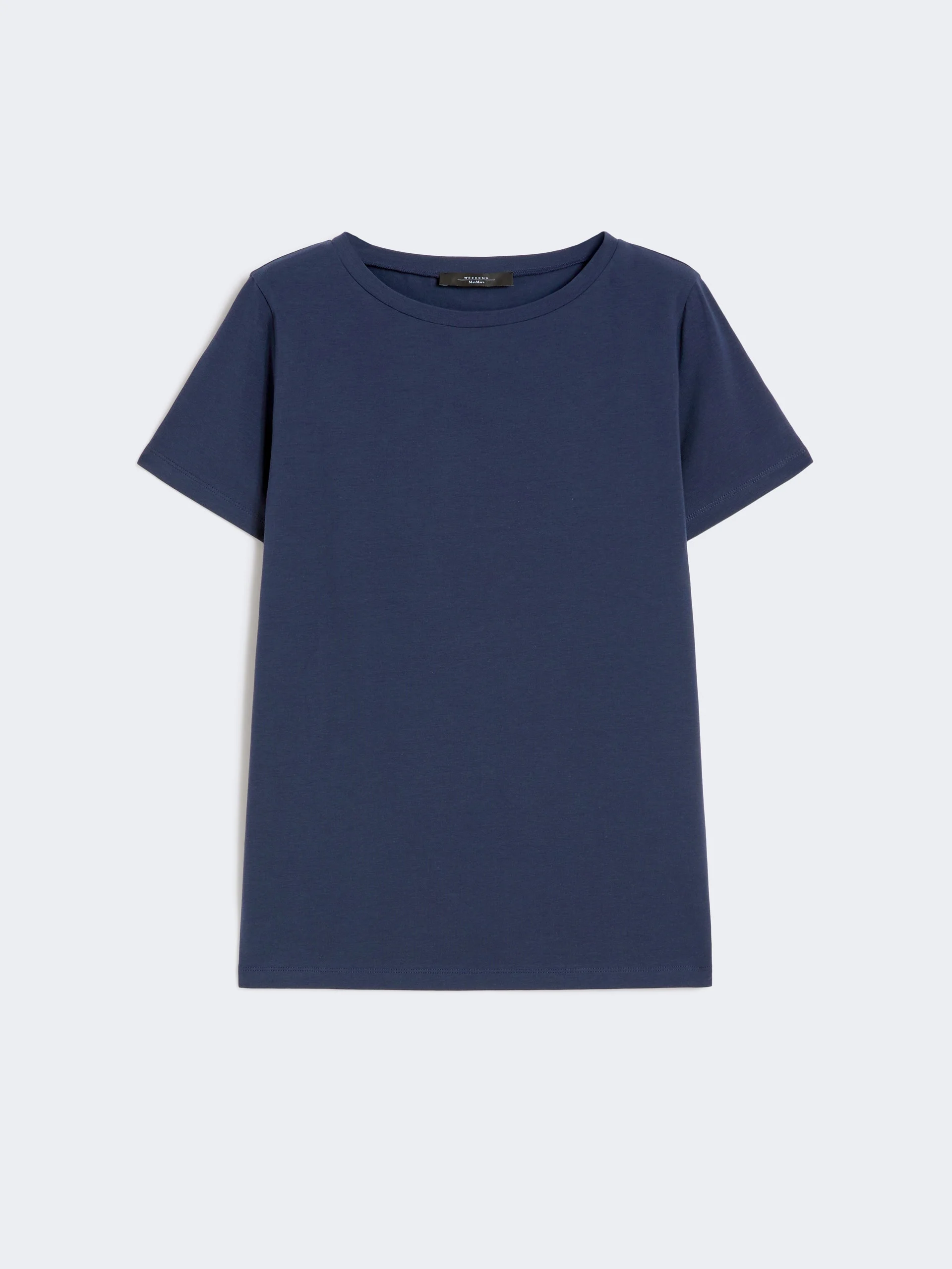 DETAILS Basic T-shirt with a regular fit and cut. Main fabric with at least 50% cotton fibers, grown and processed according to organic farming systems Stretch organic cotton jersey T-shirt Crew-neck Short set-in sleeves COMPOSITION AND CARE 95% cotton, 5% elastane. Machine wash cold delicate cycle; do not bleach; do not tumble dry; flat drying in the shade; cool iron; do not dry clean; professional wet cleaning - very mild process.; iron with a cloth between.; using neutral detergent.; turn the articles inside out before washing.; to be ironed on reverse. Distributed by Max Mara S.r.l., registered office in Reggio Emilia (Italy), Via Giulia Maramotti 4, 42124 (IT)
