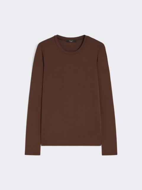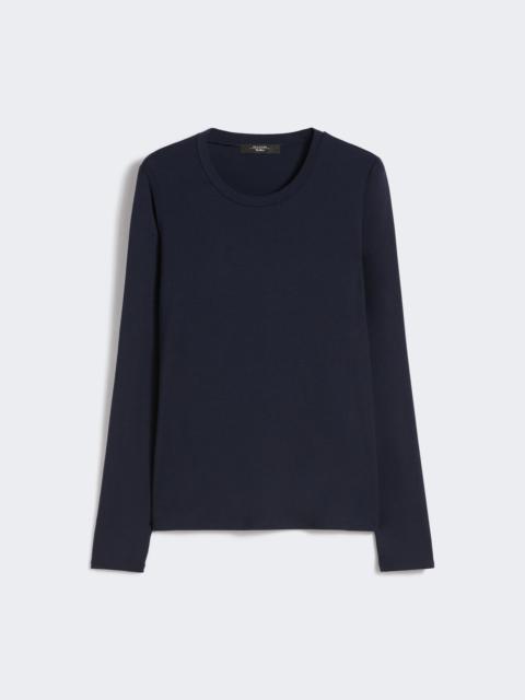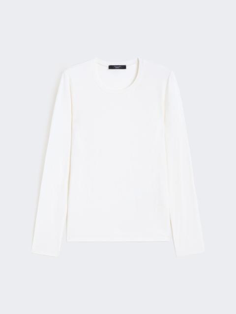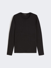 DETAILS Basic T-shirt with an essential and feminine silhouette. T-shirt in stretch-viscose jersey Figure-hugging Offset crew neck Long set-in sleeves Butterfly logo printed on the back of the collar COMPOSITION AND CARE 95% viscose, 5% elastane. Hand wash cold (40°c max); do not bleach; do not tumble dry; drip line drying in the shade; cool iron; do not dry clean; do not wet clean.; iron with a cloth between.; using neutral detergent.; don’t rub.; turn the articles inside out before washing.; to be ironed on reverse. Distributed by Max Mara S.r.l., registered office in Reggio Emilia (Italy), Via Giulia Maramotti 4, 42124 (IT)
