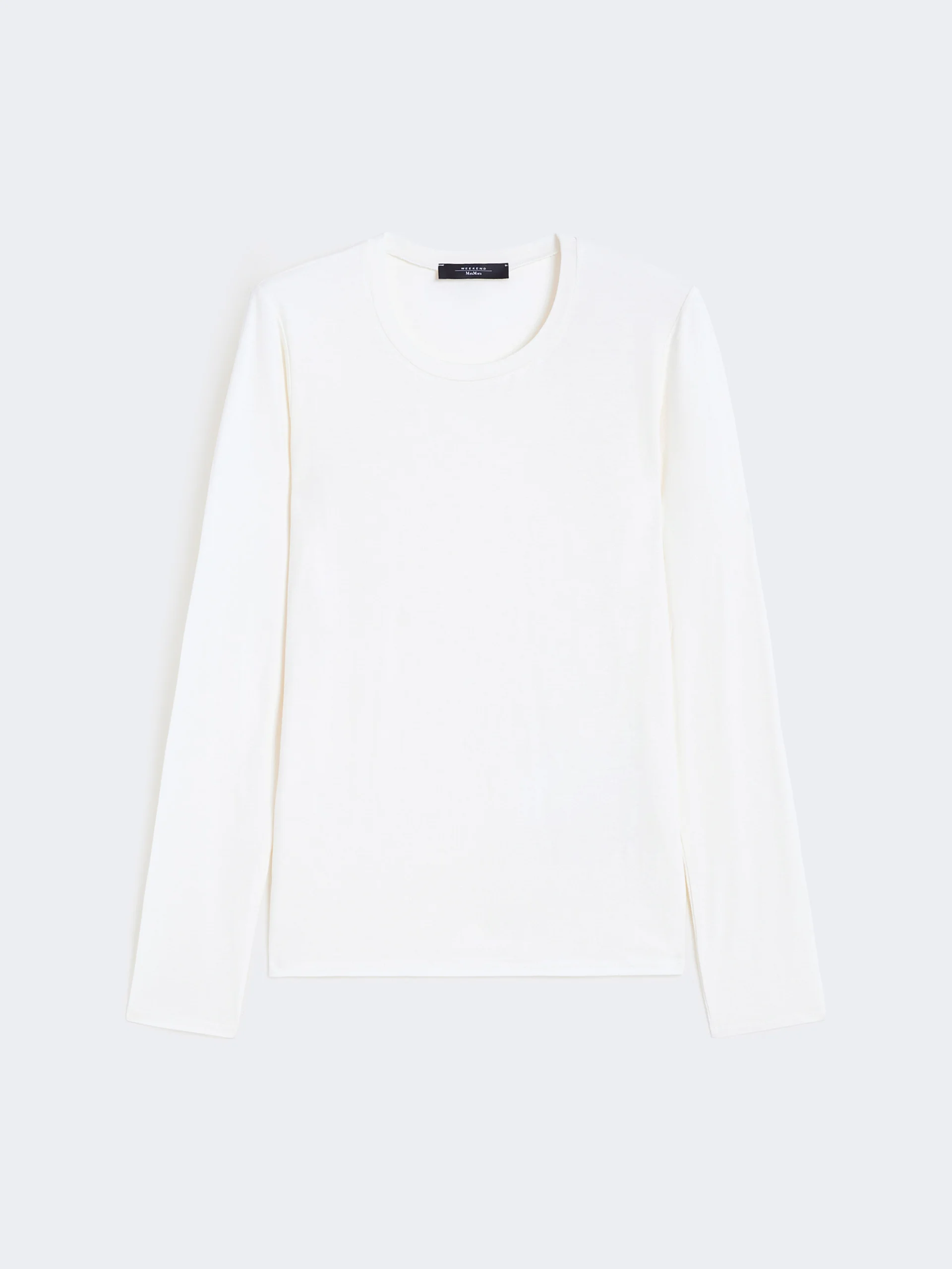 DETAILS Basic T-shirt with an essential and feminine silhouette. T-shirt in stretch-viscose jersey Figure-hugging Offset crew neck Long set-in sleeves Butterfly logo printed on the back of the collar COMPOSITION AND CARE 95% viscose, 5% elastane. Hand wash cold (40°c max); do not bleach; do not tumble dry; drip line drying in the shade; cool iron; do not dry clean; do not wet clean.; iron with a cloth between.; using neutral detergent.; don’t rub.; turn the articles inside out before washing.; to be ironed on reverse. Distributed by Max Mara S.r.l., registered office in Reggio Emilia (Italy), Via Giulia Maramotti 4, 42124 (IT)