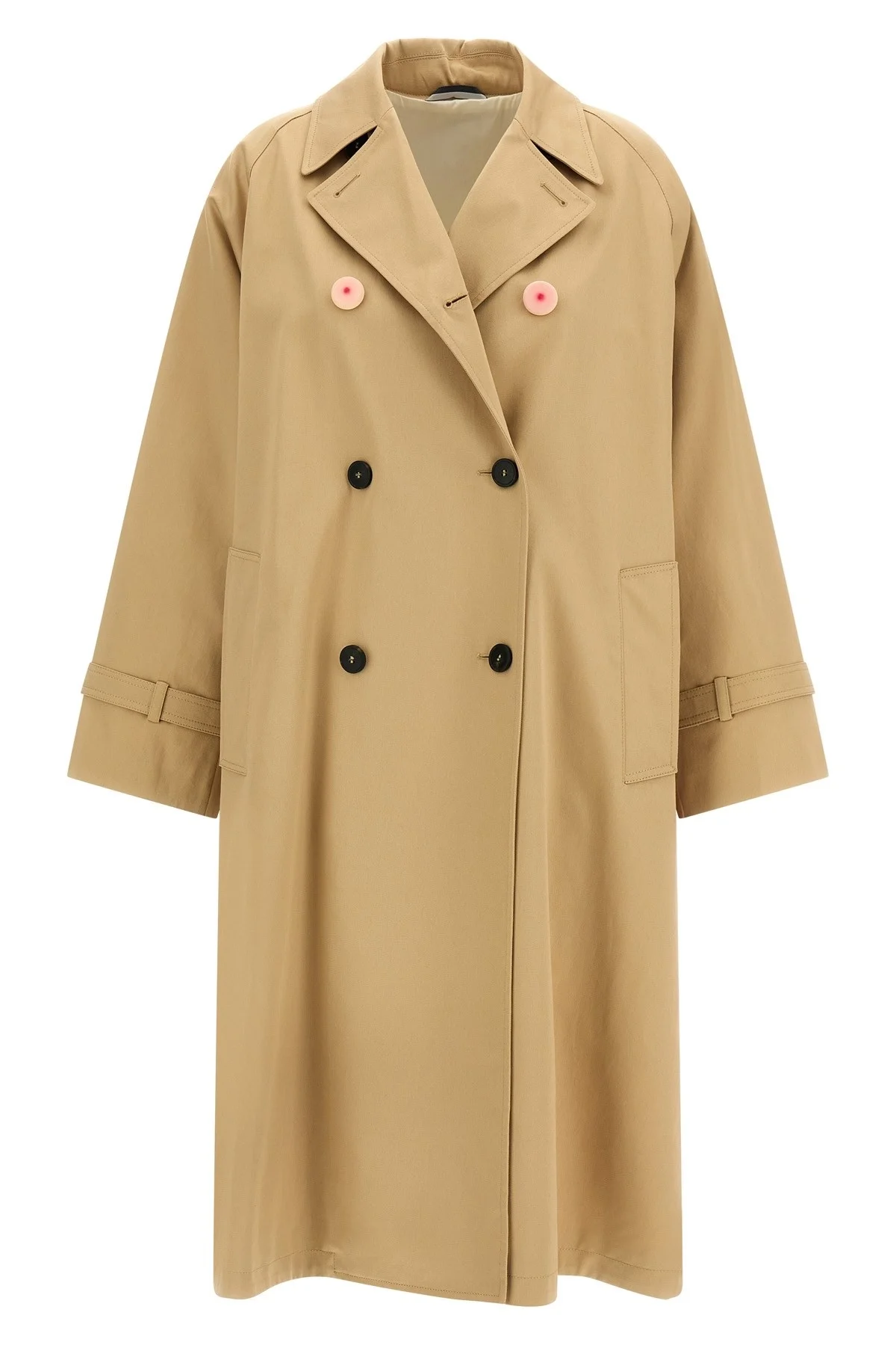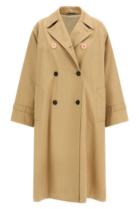 cod. 2615021016600001 'Ninfa' capsule 'A Weekend With An Artist' trench coat designed by Shafei Xia in waterproof cotton gabardine with back print, double-breasted style with front button closure, flared silhouette, lapel collar, welt pockets, long raglan sleeves with frog on the wrist, back split, lining, removable matching belt, one pair of covers buttons included. Color: Beige Size & Fit: true to size fit Composition: 100% cotton Made in: Morocco