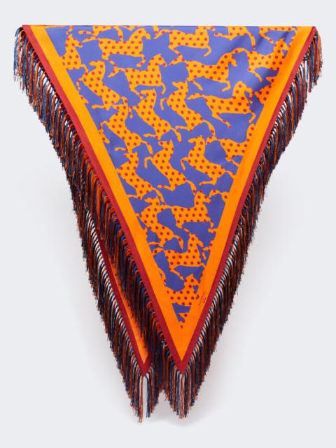 DETAILS Diamond-shaped scarf featuring an all-over version of the collection’s "Spain"-themed print. Pure silk twill scarf Hand-knotted coloured fringes at the trims Size: 183 x 72 cm COMPOSITION AND CARE Fabric 100% silk; with details in 100% viscose. Do not wash; do not bleach; do not tumble dry; cool iron; professionally dry clean perchloroethylene - mild process; do not wet clean.; please restore fringes after washing. Distributed by Max Mara S.r.l., registered office in Reggio Emilia (Italy), Via Giulia Maramotti 4, 42124 (IT)