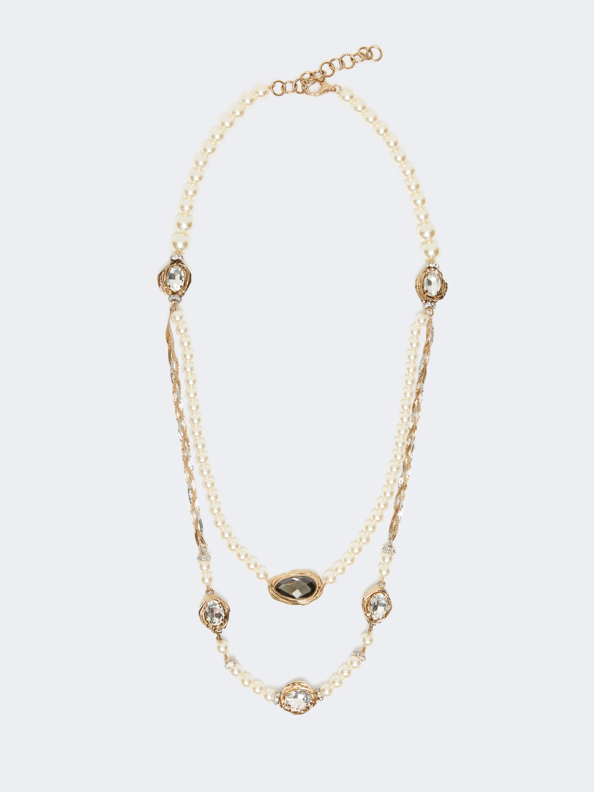 DETAILS Double strand necklace consisting of pearls with metal elements and set faceted crystals. Resin necklace Glass details Flat woven metal mesh inserts Adjustable fastening with snap-hook clasp COMPOSITION AND CARE Style in acrylic resin; with details in glass, metal. Distributed by Max Mara S.r.l., registered office in Reggio Emilia (Italy), Via Giulia Maramotti 4, 42124 (IT)