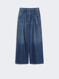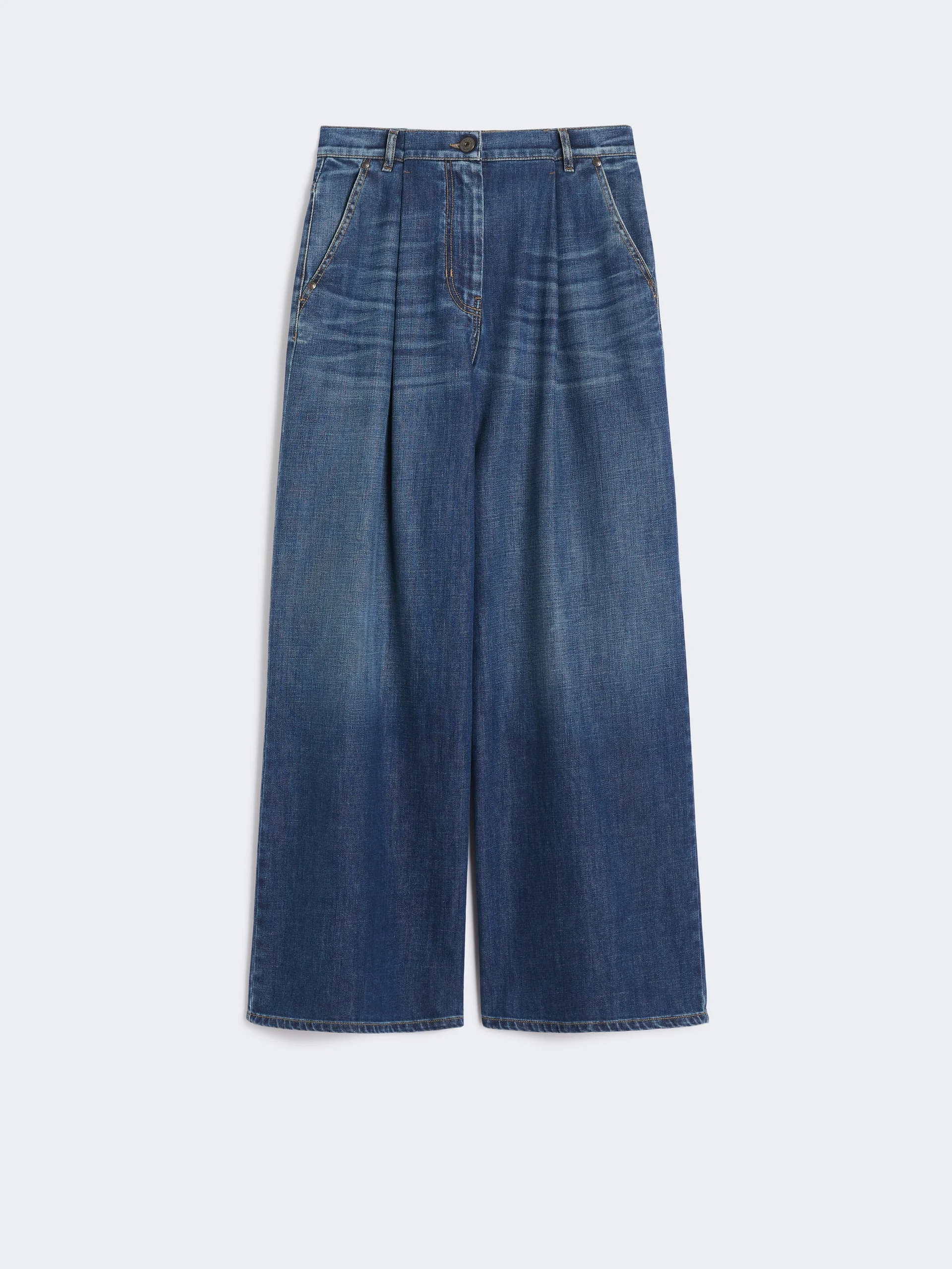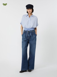 DETAILS Wide-fit trousers featuring open pleat detail on the front. Main fabric is with at least 50% cotton fibers, grown and processed according to organic farming systems Trousers in comfortable stretch cotton denim Wide-leg cut Fly-covered zip and tack button fastening Slant side pockets Patch rear pockets Adjustable strap detail on the rear waist yoke COMPOSITION AND CARE 99% cotton, 1% elastane. Machine wash cold delicate cycle; do not bleach; do not tumble dry; line drying in the shade; cool iron; do not dry clean.; wash the garment while it is fastened.; don’t iron the labels.; protect the buckle before washing.; turn the articles inside out before washing.; take care when wearing light-coloured clothes or accessories because, with the heat of the body, the indigo fabric , may fade and stain. be careful while sitting on light coloured surfaces, especially if wet. wash garments separately and always turned inside out. hang the garment turned inside out by avoiding to expose it to direct sunlight. avoid removing isolated stains.; contains non-textile parts of animal origin. Distributed by Max Mara S.r.l., registered office in Reggio Emilia (Italy), Via Giulia Maramotti 4, 42124 (IT)
