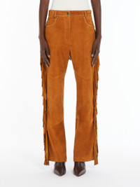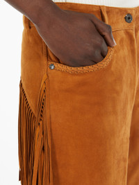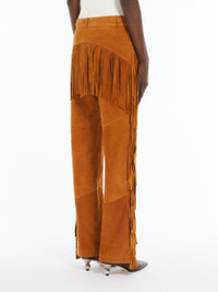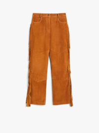 DETAILS Slightly flared soft suede trousers. The jeans-style model boasts suede fringe detail along the sides and rear yoke. Fly-covered zip and button fastening. Everyday style meets refinement and western charm in the Signature Collection by Lucy Hale for Weekend Max Mara. A loving tribute to the western aesthetic, with clean-cut garments and iconic detailing. Effortless looks melding comfort, elegance and authenticity. COMPOSITION AND CARE Style in goat leather; lining in 100% polyester. Do not wash; do not bleach; do not tumble dry; do not iron; do not dry clean; do not wet clean.; do not wash or dry clean by fabric methods. clean only by leather and fur specialists.; care should be taken with light-coloured garments and accessories because body heat could lead the leather to colour loss and staining. care should be taken when sitting on light-coloured surfaces, especially if damp. avoid lengthy exposure to direct light or heat sources. do not store garments in plastic bags for long periods. Distributed by Max Mara S.r.l., registered office in Reggio Emilia (Italy), Via Giulia Maramotti 4, 42124 (IT)