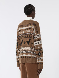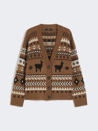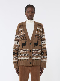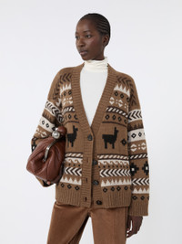 DETAILS Oversized cardigan, embellished with an all-over jacquard knit. Cardigan in alpaca and wool yarn V neck Long sleeves with dropped shoulders Button fastening at the front Ribbed edges COMPOSITION AND CARE 45% acrylic, 40% alpaca, 15% wool. Hand wash cold (40°c max); do not bleach; do not tumble dry; flat drying in the shade; cool iron; professionally dry clean perchloroethylene - mild process; do not wet clean.; iron with a cloth between.; using neutral detergent. Distributed by Max Mara S.r.l., registered office in Reggio Emilia (Italy), Via Giulia Maramotti 4, 42124 (IT)