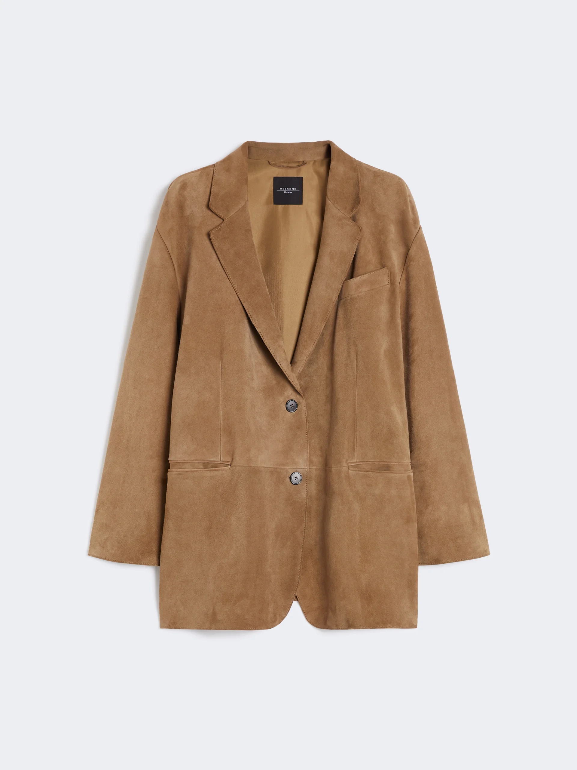 DETAILS Oversized single-breasted blazer featuring slightly dropped shoulders. - Blazer in soft suede material - Deep lapel collar - Buttoned-hem long sleeves - Horn-look button fastening on the front - Breast pocket - Flap front pockets - Lined model COMPOSITION AND CARE Style in goat leather; lining in 100% polyester. Do not wash; do not bleach; do not tumble dry; do not iron; do not dry clean; do not wet clean.; do not wash or dry clean by fabric methods. clean only by leather and fur specialists.; care should be taken with light-coloured garments and accessories because body heat could lead the leather to colour loss and staining. care should be taken when sitting on light-coloured surfaces, especially if damp. avoid lengthy exposure to direct light or heat sources. do not store garments in plastic bags for long periods. Distributed by Max Mara S.r.l., registered office in Reggio Emilia (Italy), Via Giulia Maramotti 4, 42124 (IT) Collection: Weekend Max Mara Product code: 5446075106001 - ROLANDA