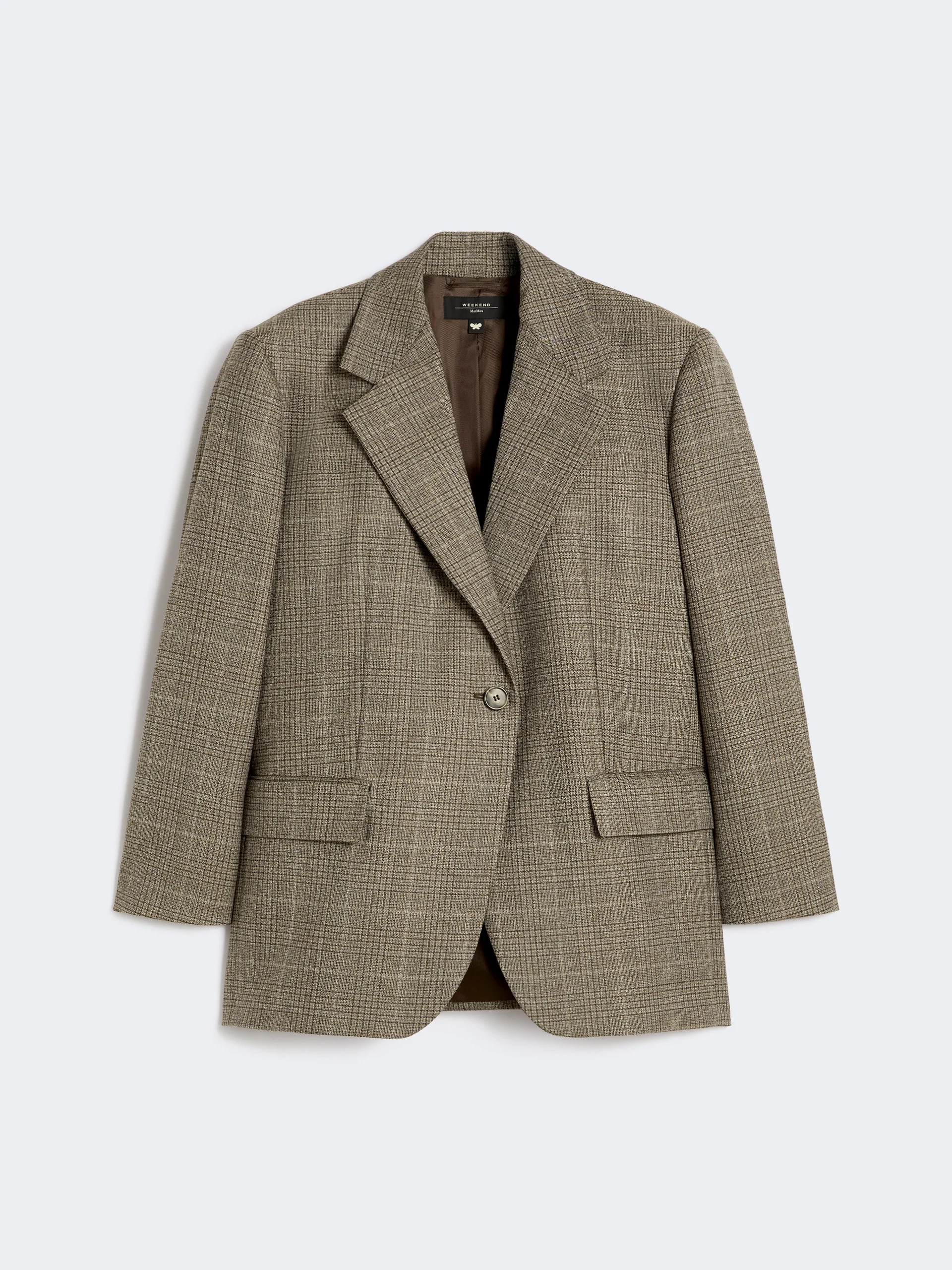 DETAILS Single-breasted mannish-style blazer featuring a classic Glen plaid pattern. - Blazer in patterned pure wool twill fabric - Oversized fit with a central rear slit - Lapel collar - Set-in sleeves with buttoned cuffs - Single-button front fastening - Breast pocket and flap welt pockets at the side - Lined model COMPOSITION AND CARE Fabric 100% virgin wool; lining 50% acetate, 50% viscose; lining 2 51% acetate, 49% viscose. Do not wash; do not bleach; do not tumble dry; cool iron; professionally dry clean perchloroethylene - mild process; do not wet clean.; wash the garment while it is fastened.; contains non-textile parts of animal origin. Distributed by Max Mara S.r.l., registered office in Reggio Emilia (Italy), Via Giulia Maramotti 4, 42124 (IT) Collection: Weekend Max Mara Product code: 5041046106001 - WKDMAGMA