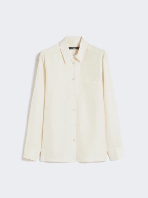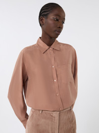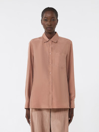 DETAILS Soft silhouette shirt with chest pocket. Pure washed silk shirt Slightly flared skirt at the hem Shirt collar and cuffs Long set-in sleeves Front fastening with visible buttons Yoke seam and central pleat on the back Rounded hem COMPOSITION AND CARE 100% silk. Hand wash cold (40°c max); do not bleach; do not tumble dry; line drying in the shade; cool iron; professionally dry clean perchloroethylene - mild process; do not wet clean.; wash the garment while it is fastened.; turn the articles inside out before washing.; contains non-textile parts of animal origin. Distributed by Max Mara S.r.l., registered office in Reggio Emilia (Italy), Via Giulia Maramotti 4, 42124 (IT)