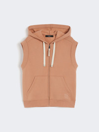 DETAILS Soft-textured gilet featuring a drawstring hood and branded WKND ribbons. Main fabric with at least 50% cotton fibers, grown and processed according to organic farming systems Cotton fleece jersey gilet Boxy fit Front zip fastening Kangaroo front pocket with embroidered logo detail Dropped shoulders Rib-knit trim COMPOSITION AND CARE Jersey fabric 87% cotton, 13% polyester; - exclusive of embroideries. Machine wash cold delicate cycle; do not bleach; do not tumble dry; flat drying in the shade; cool iron; do not dry clean; professional wet cleaning - very mild process.; iron with a cloth between.; using neutral detergent.; turn the articles inside out before washing.; to be ironed on reverse. Distributed by Max Mara S.r.l., registered office in Reggio Emilia (Italy), Via Giulia Maramotti 4, 42124 (IT)