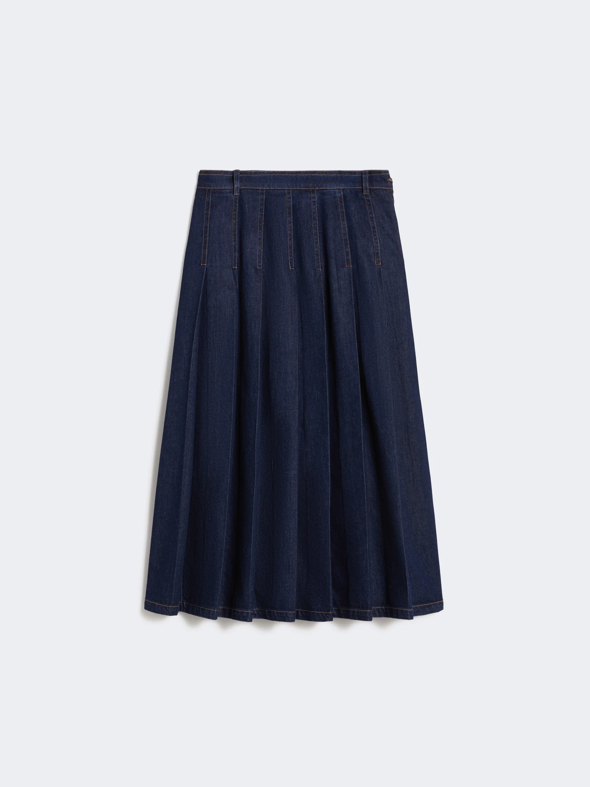 DETAILS Long skirt with semi-sewn ironed pleats and stitching motif on the sides. - Skirt in soft pure cotton denim fabric - Slightly flared fit - Side zip and tack button fastening - Belt loop detail at the waist - Branded rear hem tag - Unlined model COMPOSITION AND CARE 100% cotton. Machine wash cold delicate cycle; do not bleach; do not tumble dry; line drying in the shade; cool iron; do not dry clean.; wash the garment while it is fastened.; don’t iron the labels.; protect buttons before washing.; after washing fix the pleats by ironing them.; take care when wearing light-coloured clothes or accessories because, with the heat of the body, the denim fabric that comes into contact with them may bleed and stain. be careful while sitting on pale colored surfaces, especially if wet. wash denim items separately and always turned inside out. hang the garment turned inside out by avoiding to expose it to direct sunlight. avoid removing isolated stains.; contains non-textile parts of animal origin. Distributed by Max Mara S.r.l., registered office in Reggio Emilia (Italy), Via Giulia Maramotti 4, 42124 (IT) Collection: Weekend Max Mara Product code: 5101076106001 - WKDOVALE