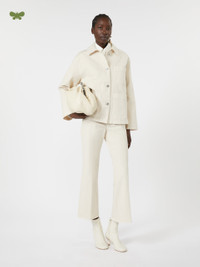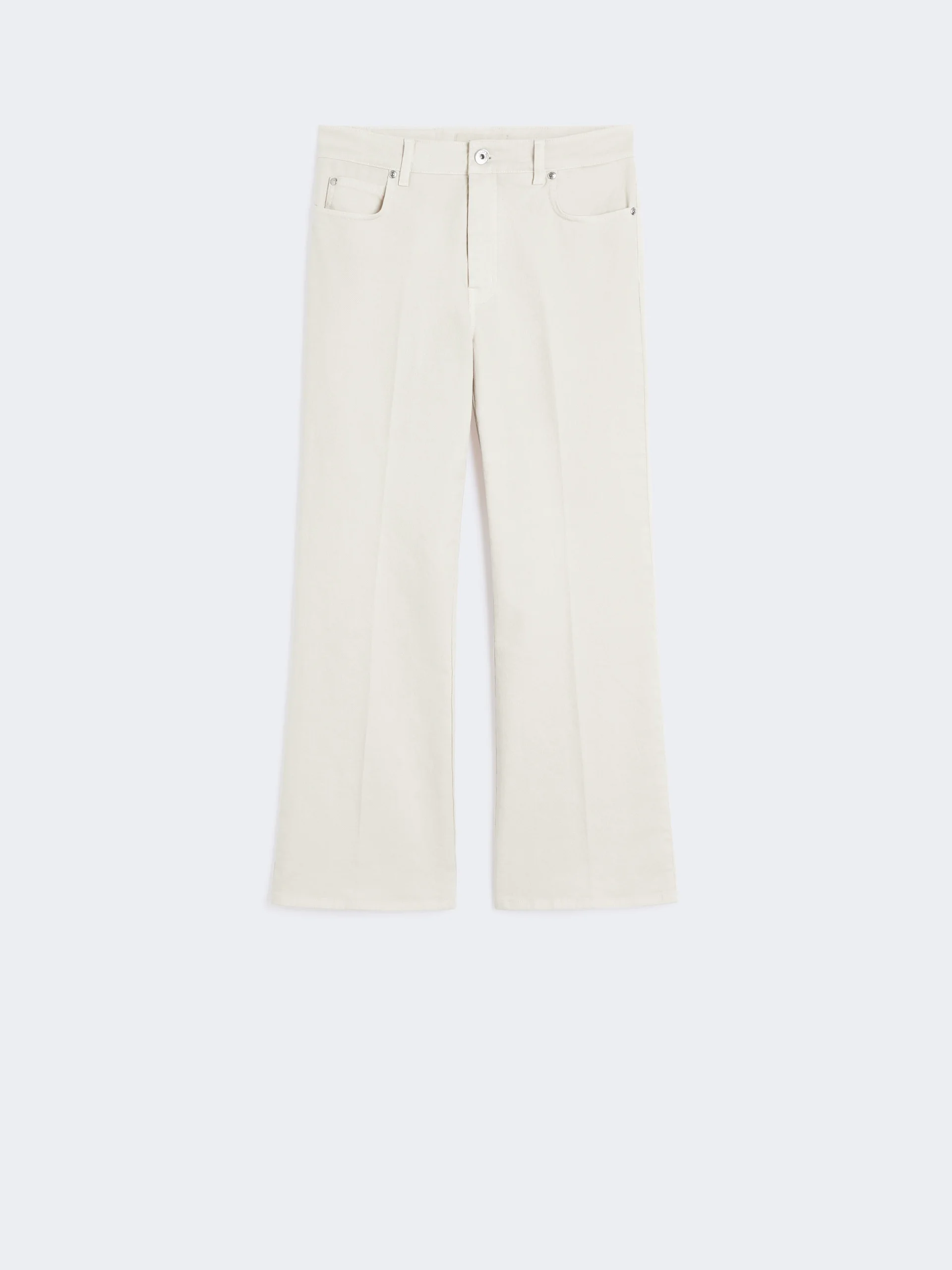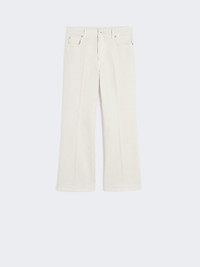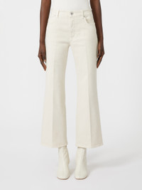DETAILS 5-pocket jeans embellished with iconic details. - Main fabric with cotton fibers grown through regenerative agriculture practice - Stretch cotton bull denim jeans - Slightly flared at the hem - Fly-covered zip and tack button fastening - Rear waist yoke - Belt loops and pressed pleat detail COMPOSITION AND CARE 99% cotton, 1% elastane. Machine wash cold delicate cycle; do not bleach; do not tumble dry; line drying in the shade; cool iron; do not dry clean.; wash the garment while it is fastened.; wash separately.; don’t iron the labels.; turn the articles inside out before washing.; dyed article. the unevennes of the dye and the pressing form its characteristic.; this item may leave colour stains on brightly-coloured garments.; contains non-textile parts of animal origin. Distributed by Max Mara S.r.l., registered office in Reggio Emilia (Italy), Via Giulia Maramotti 4, 42124 (IT)