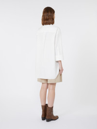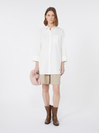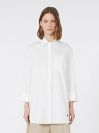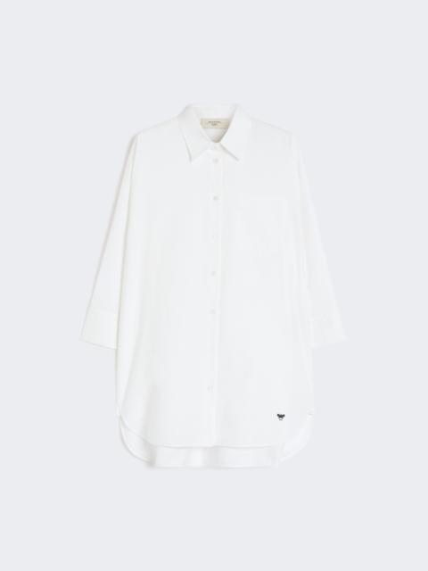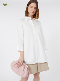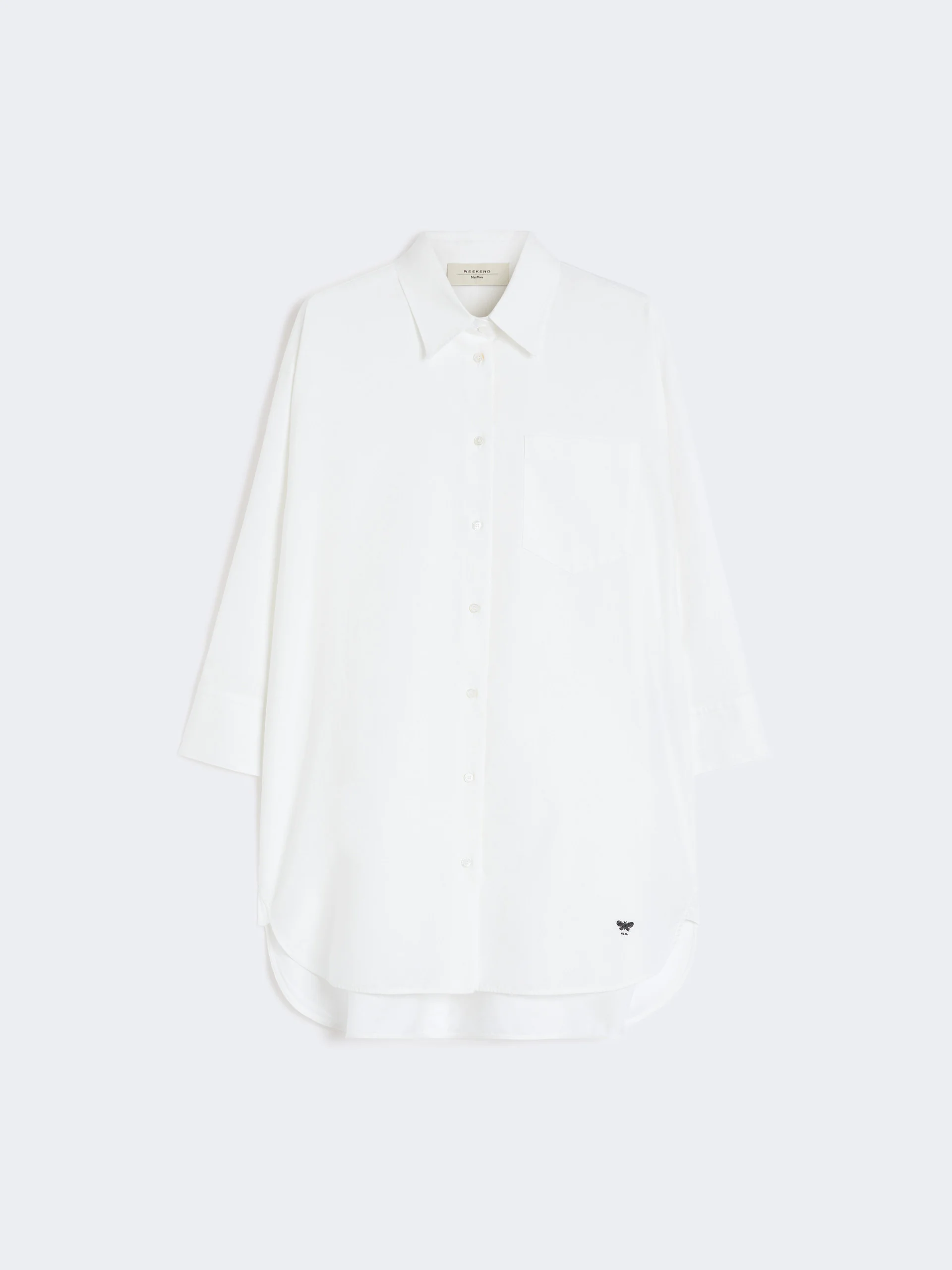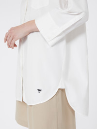 DETAILS Oversized long shirt with a subtle high-low rounded hem design. Main fabric with cotton fibers, grown and processed according to organic farming systems Shirt in pure cotton Oxford cloth Double button detail on the pointed collar and cuffs Drop-shoulder 3/4 sleeves Visible button fastening on the front Patch breast pocket Side slits and embroidered butterfly logo detail on the front COMPOSITION AND CARE Fabric 100% cotton; - exclusive of embroideries. Machine wash cold delicate cycle; do not bleach; do not tumble dry; line drying in the shade; cool iron; professionally dry clean perchloroethylene - mild process.; wash the garment while it is fastened.; turn the articles inside out before washing.; contains non-textile parts of animal origin. Distributed by Max Mara S.r.l., registered office in Reggio Emilia (Italy), Via Giulia Maramotti 4, 42124 (IT)