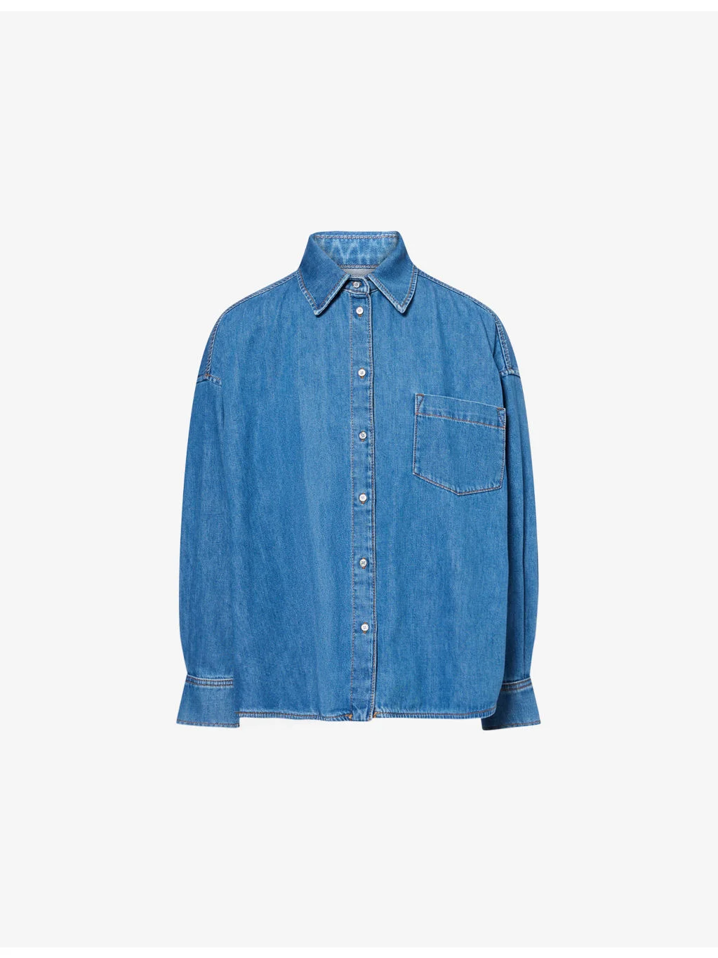 PRODUCT DETAILS - Weekend Max Mara denim shirt - 100% cotton - Button fastening - Relaxed fit, collar, dropped shoulders, long sleeves, buttoned cuffs, patch pocket at chest, butterfly embroidery at hem front, washed finish, contrast stitching, curved hem - Machine wash cold - Made in Tunisia - True to size - Model is 5ft 10in/1.78m and wears a size UK 8 - Lightweight, non-stretch Ref: R04552939