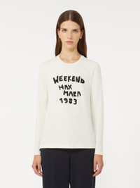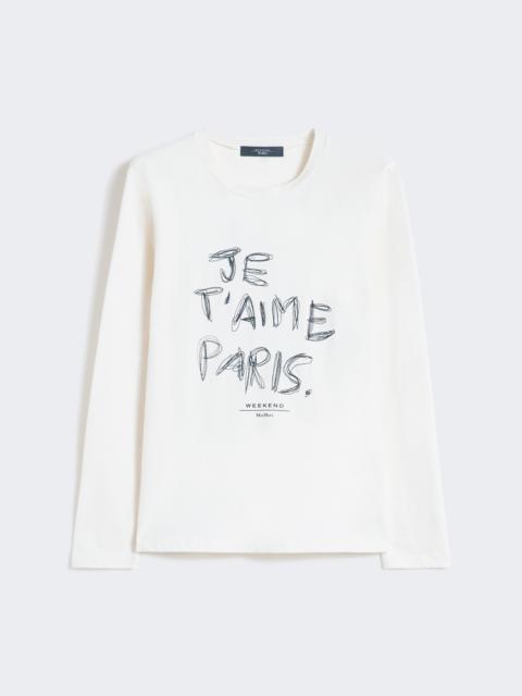 DETAILS Long-sleeved T-shirt with collection motif and embroidered details on the front. T-shirt in stretch-cotton jersey Figure-hugging Crew neck Set-in sleeves Butterfly logo on the back of the neck COMPOSITION AND CARE Jersey fabric 95% cotton, 5% elastane; - exclusive of decoration. Hand wash cold (40°c max); do not bleach; do not tumble dry; flat drying in the shade; cool iron; do not dry clean; do not wet clean.; iron with a cloth between.; using neutral detergent.; don’t rub.; turn the articles inside out before washing.; to be ironed on reverse. Distributed by Max Mara S.r.l., registered office in Reggio Emilia (Italy), Via Giulia Maramotti 4, 42124 (IT)