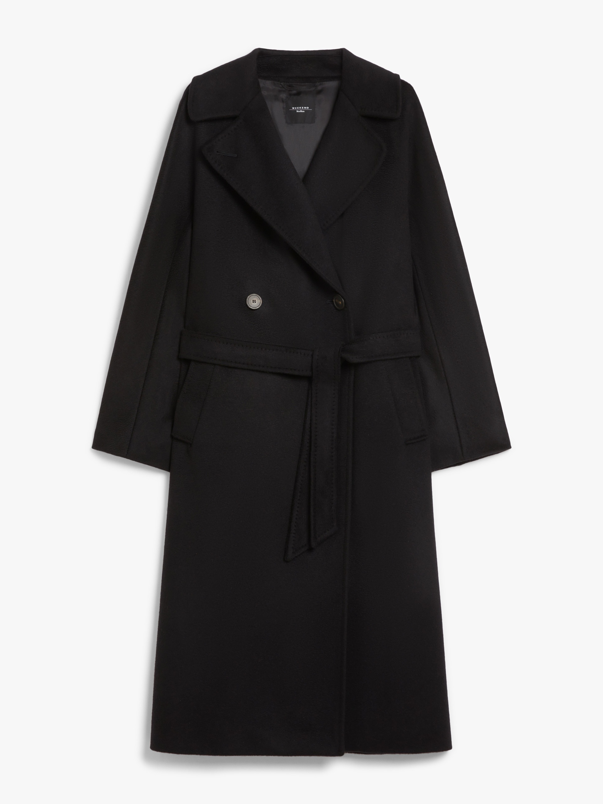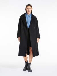 DETAILS Long double-breasted coat in fine pure wool broadcloth. The lined model boasts a straight fit, wide lapel collar, long kimono sleeves and welt side pockets. Embellished with tailored details and a central rear vent. Visible button fastening and a silhouette-accentuating matching belt. COMPOSITION AND CARE Fabric 100% virgin wool; lining 50% acetate, 50% viscose. Do not wash; do not bleach; do not tumble dry; cool iron; professionally dry clean perchloroethylene - mild process; do not wet clean. Distributed by Max Mara S.r.l., registered office in Reggio Emilia (Italy), Via Giulia Maramotti 4, 42124 (IT)