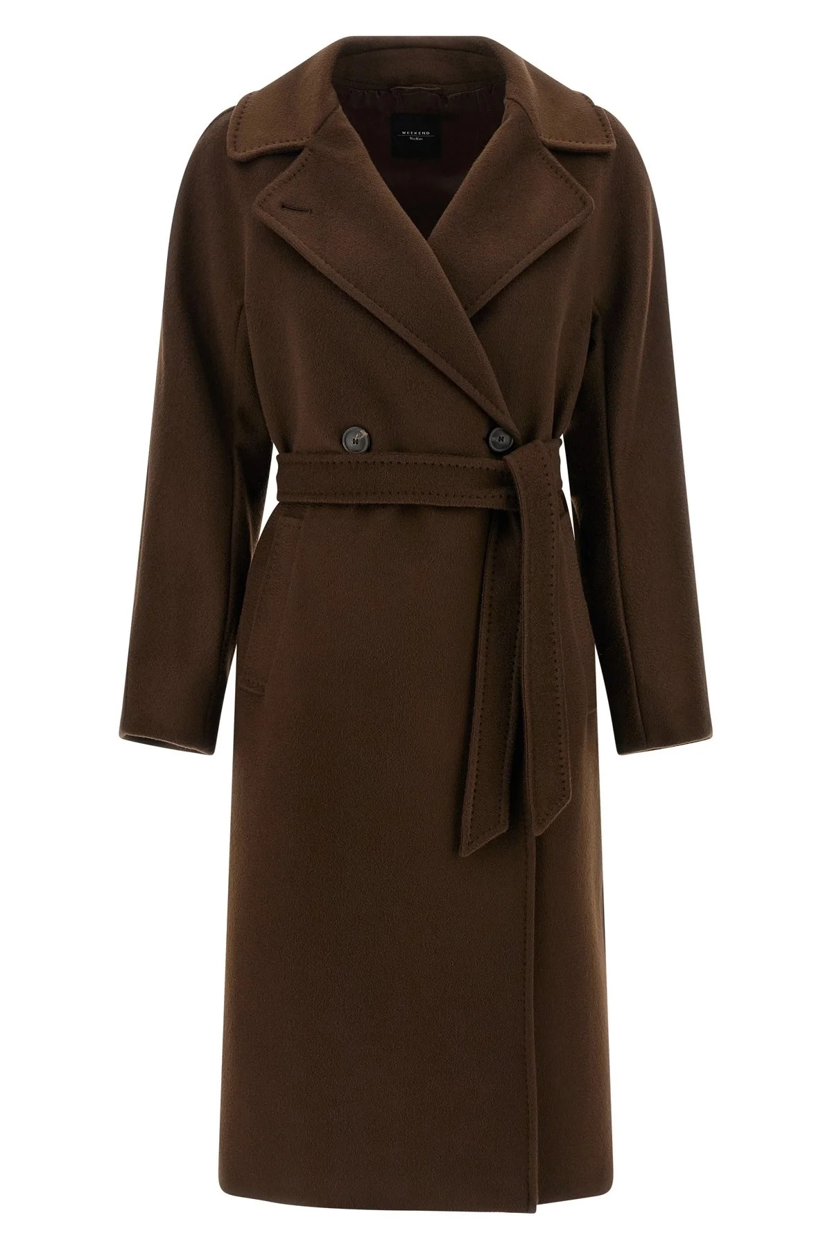 cod. 2525016102600089 'Resina' double-breasted V-neck wool coat with wide lapels, button closure, side pockets, back central split, knotted belt at the waist, long and wide sleeves, Color: Brown Size & Fit: True to size fit Composition: 100% virgin wool Made in: Romania