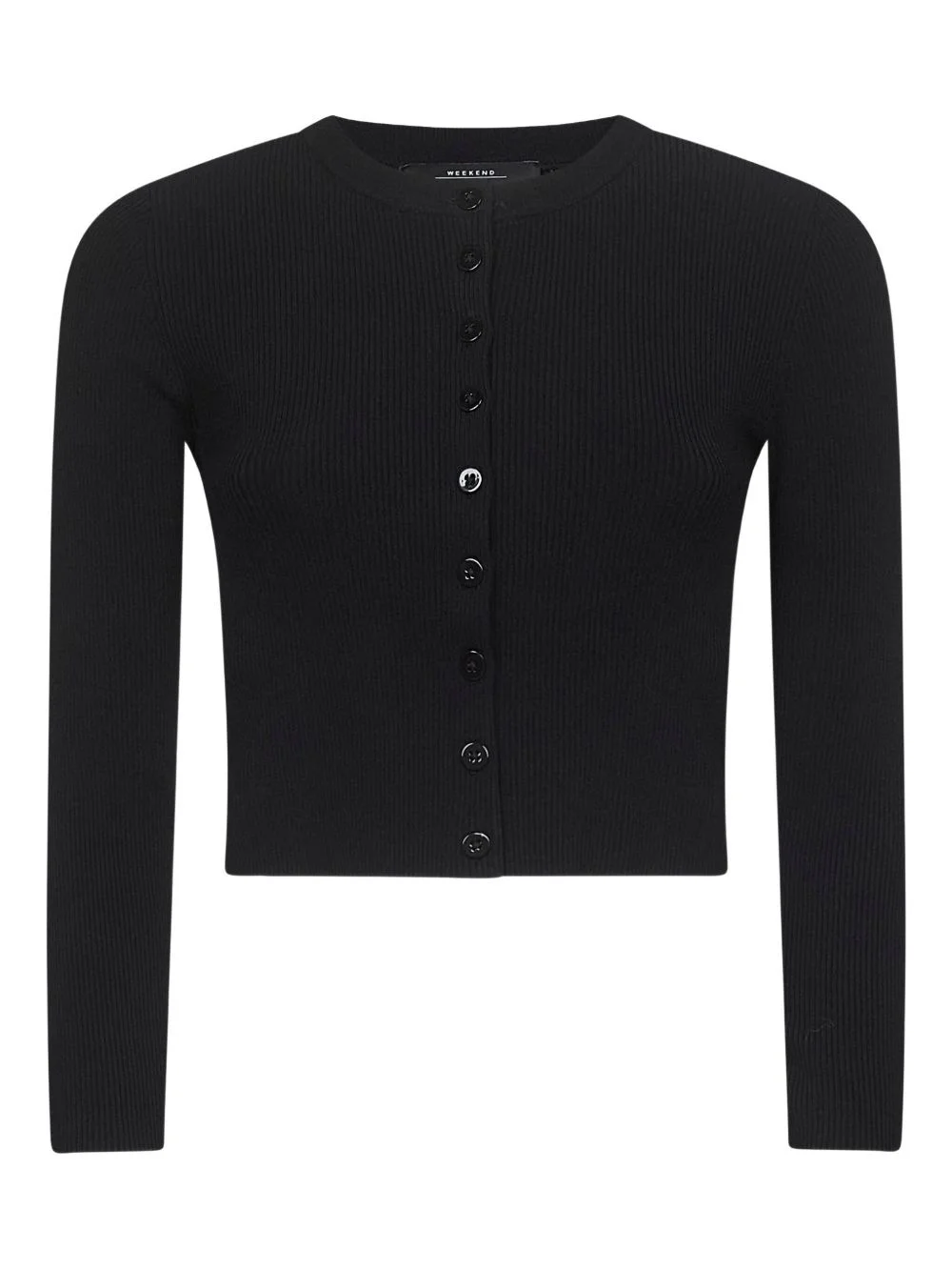 ribbed buttoned cardigan Highlights - Black - Ribbed knit - Button placket - Crew neck - Long sleeves Imported Composition Viscose 83%, Polyester 17% Washing instructions Read Manufacturer Guidelines
