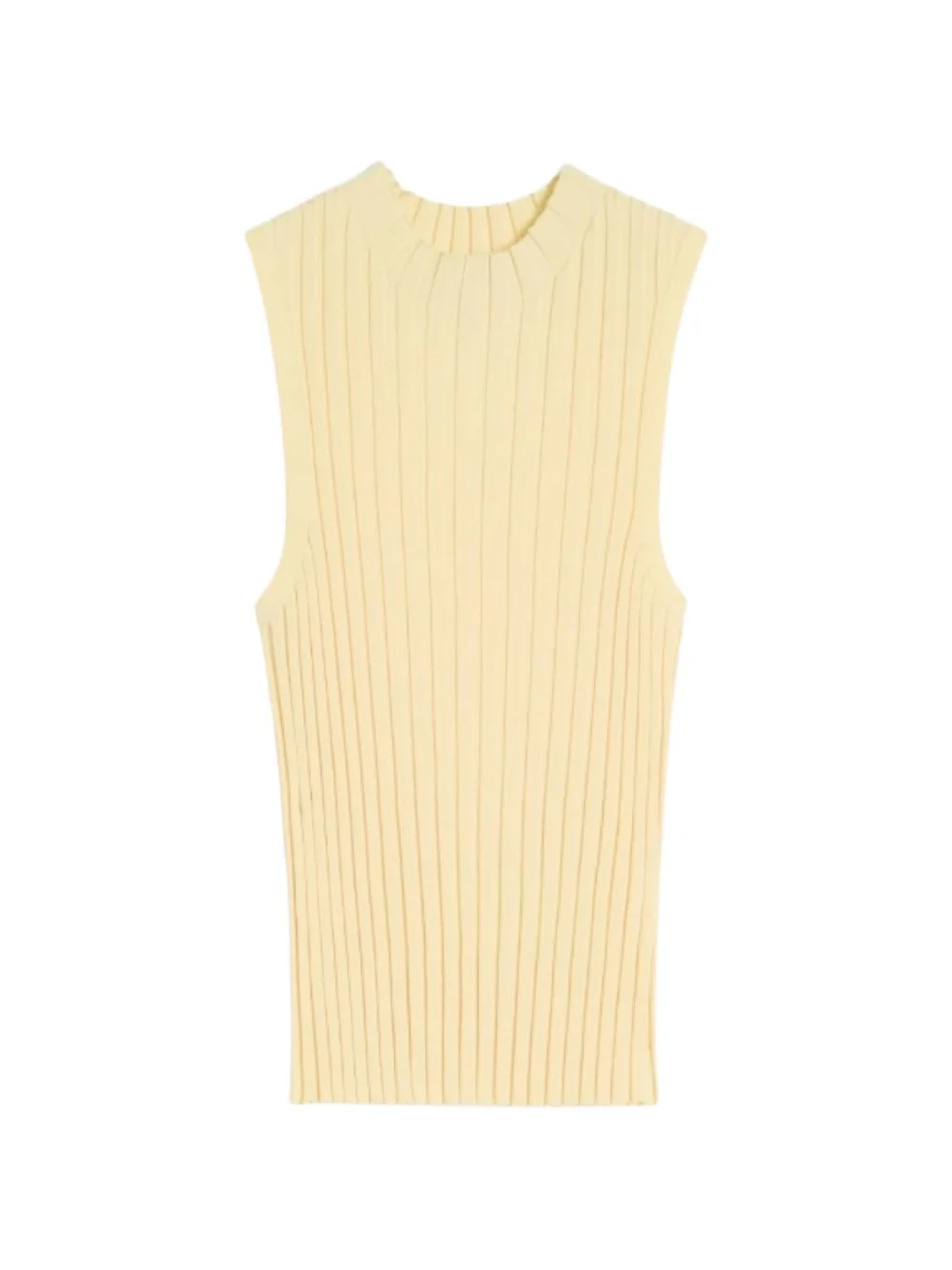 ribbed knitted top Highlights - Light yellow - Ribbed knit - Sleeveless - Round neck Imported Composition Viscose 77%, Polyamide 23% Washing instructions Read Manufacturer Guidelines